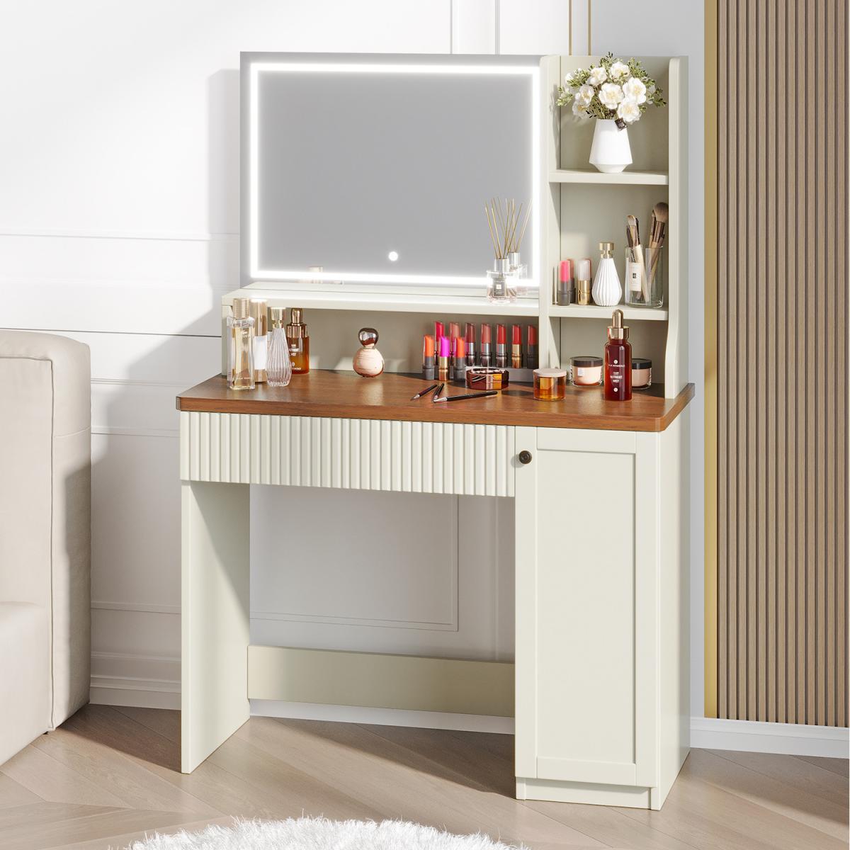 The vanity dressing table with 3 tabletop shelves, 1 large drawer and 1 door (has 3 tiers of storage shelves), our dressing tables offer ample storage space for all your cosmetics, jewellery, books, photos, decorations, mini blow dryer etc. with a large LED mirror, touch sense switch, 3 adjustable light colours: cold white, warm white and warm yellow. Suitable for dressing room, bedroom, salon, live broadcast etc