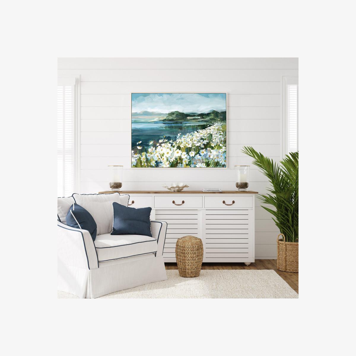 I love this spot-on daisy print for its fresh, airy feel-perfect for creating a light, relaxing atmosphere. Its sizeable frame makes it a great focal point in living rooms or bedrooms with a coastal or cottage vibe, especially when paired with neutral tones and natural textures. To style it effectively, consider balancing it with other botanical or ocean-inspired accessories, and hang it at eye level to maximize impact. It works well with whitewashed furniture and soft textiles, making it ideal for interiors that aim for a calm, effortless look.