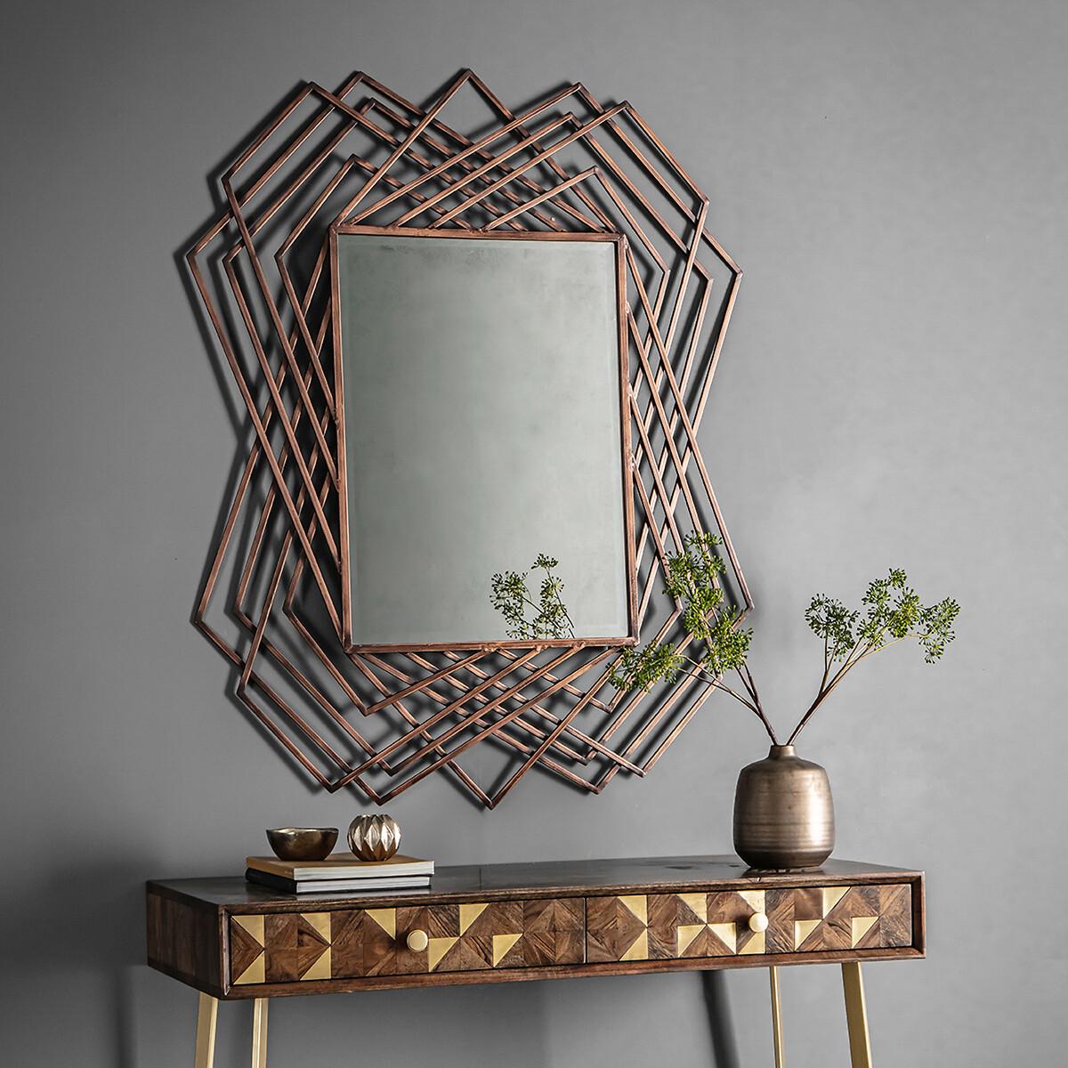 Striking feature mirror with a bold geometric frame in an burnished copper finish. Please note: this product cannot be delivered to all Offshore Islands Northern Ireland or Republic of Ireland. This product will be dispatched by one of our trusted suppliers. You’ll be contacted by their selected courier about your delivery.