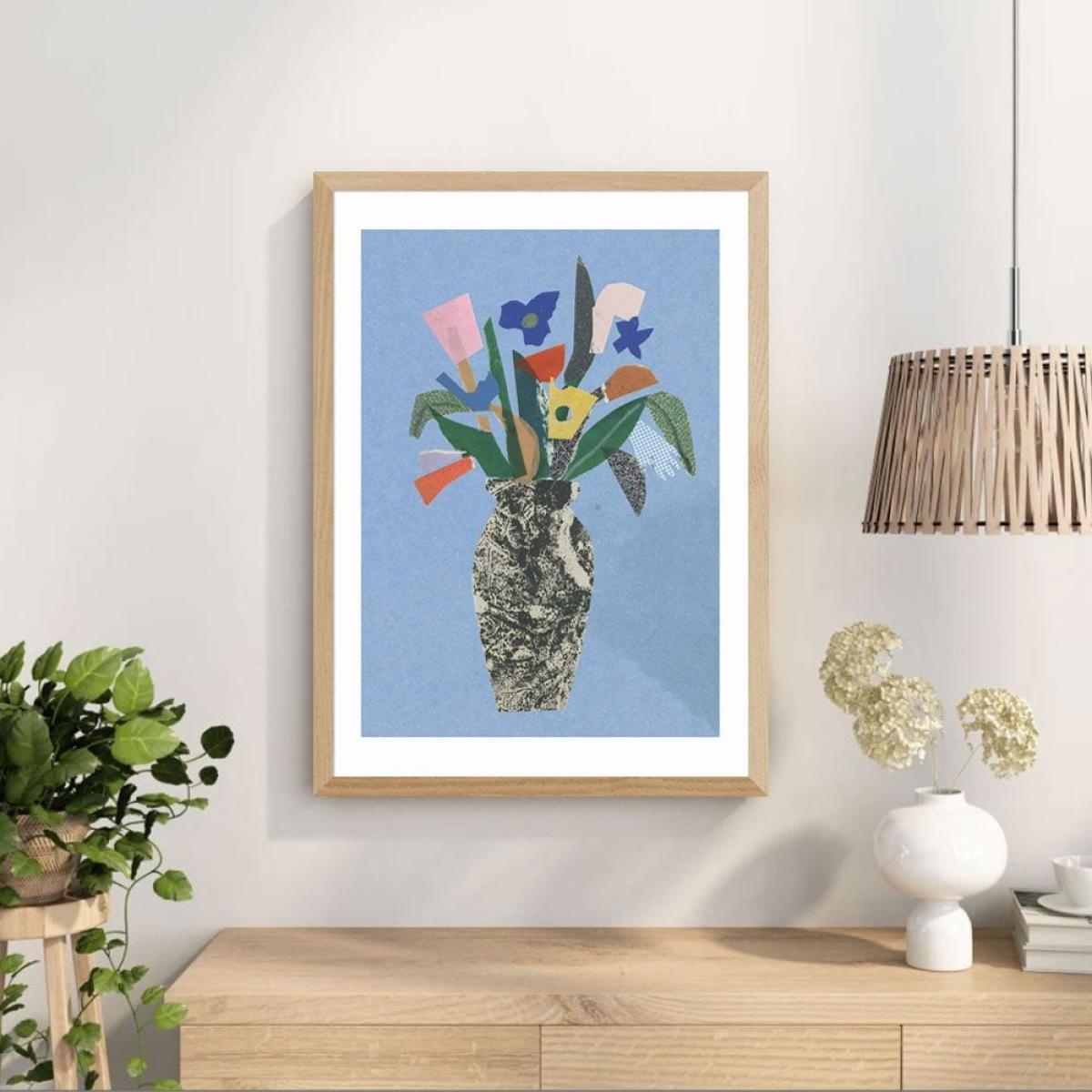 An abstract vase filled with colourful flowers highlights mixed media and collage techniques to give your home a creative vibe. The use of colour and shape in this attractive print offers calm to settings such as bedrooms and home office spaces. Only giclée printing processes are used for this print resulting in the highest quality museum-level colours and sharpness. Choose between a number of different coloured frames and two sizes for the perfect print for your space.