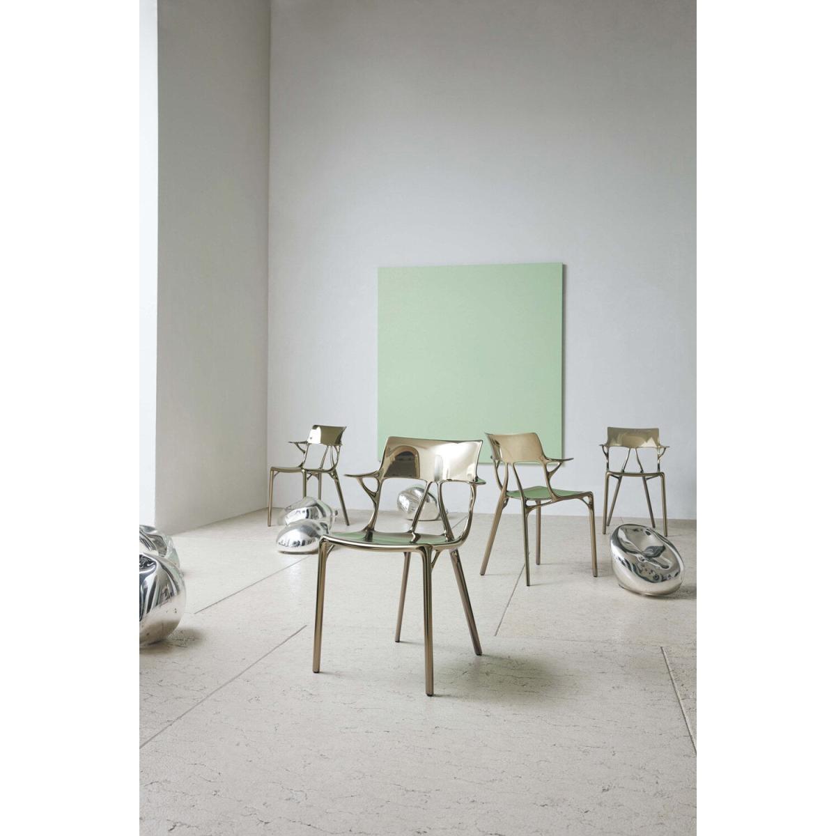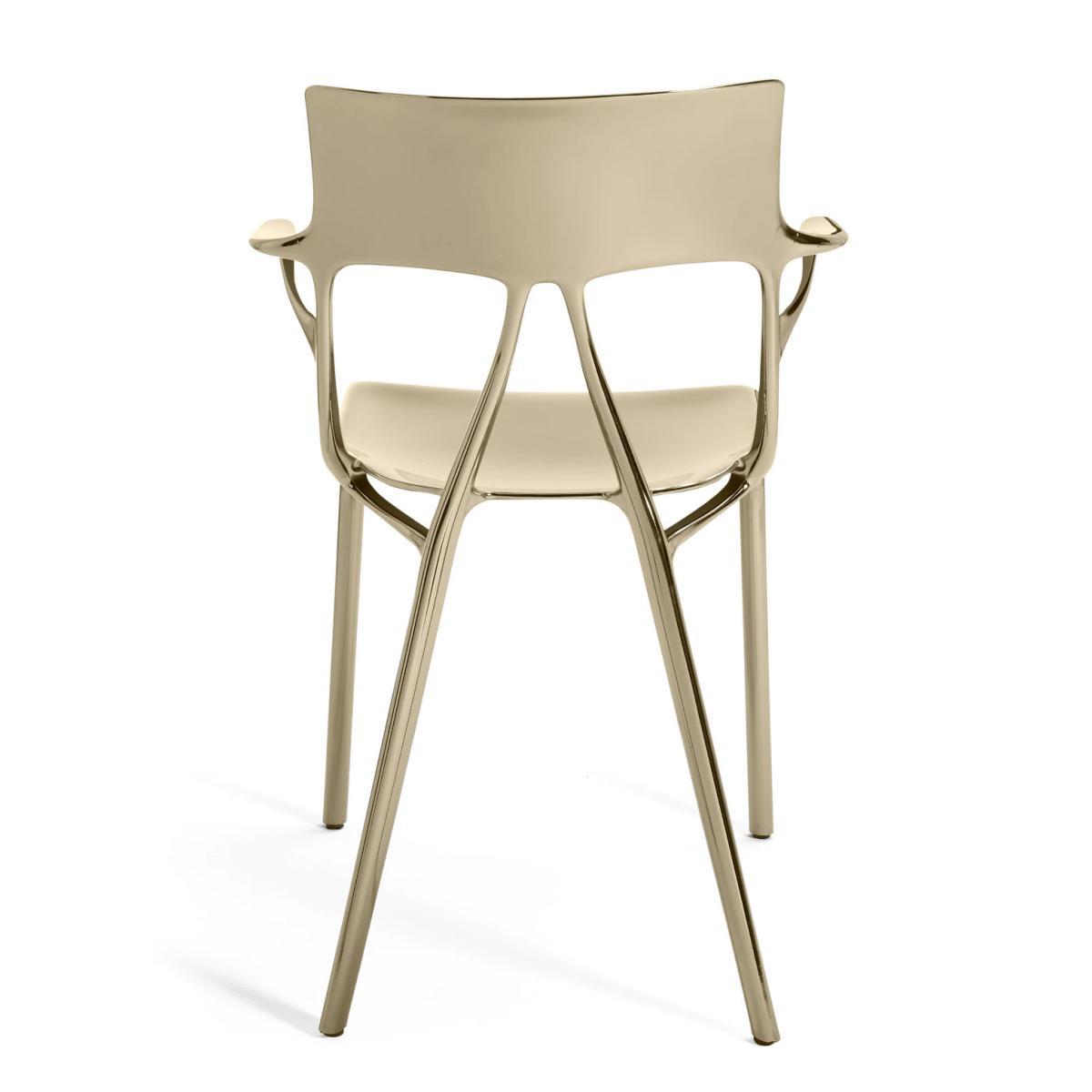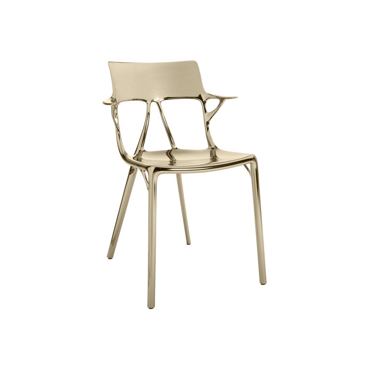 Precious. The A. I armchair shines with new metallic finishes which enhance the design. The plastic becomes noble and sophisticated, granting a luxurious and glamorous dimension to Kartell best sellers. The future is taking shape at Kartell. Pioneer and visionary, the famous designer, Philippe Starck, continues to innovate: he has created the first chair designed by artificial intelligence. To draw it, Starck used Autodesk, an American company specialised in 3D design software. To design the A. I. (Artificial Intelligence) chair, Philippe Starck, Autodesk and Kartell asked a single yet crucial question of Dreamcatcher (the generative design software developed by Autodesk): "Would you be able to give our bodies a rest by using as little materials and energy as possible? With no culture, memories or influence, the software only responded with intelligence, its "artificial" intelligence. " A. I. Is the first chair designed outside of our brains, outside of our ways of thinking. Human creative thought and artificial intelligence therefore merged to design a chair made completely by an algorithm which meets the original requirements: creating a comfortable, study chair in line with the Kartell collections' aesthetics, with as little material and energy as possible. The A. I. Chair is the result of joint work between artificial and human intelligence, defined by Starck himself as "Natural intelligence". Autodesk stated that the design process with the artificial intelligence software was reminiscent of ""a child learning’’. Starck described this process as very similar to a conversation between two human beings. "Why do chairs all look like each other? How can you create a structurally different chair? At a point, I needed to open a new door. " explained Philippe Starck concerning the creation of the A. I. Chair project. This collaboration between human and artificial intelligence has shown that artificial intelligence can assist the work of a designer by calculating what the optimal responses are to a design idea. The A. I. Chair is a symbol of the experimental approach of design and the ecological involvement of the designer Philippe Starck. "Coming from elsewhere, a new world is now open to us. An unlimited world. " concluded Starck. No doubt the A. I. Chair marks a turning point for the future of design. Mark Davis, Design Futures Director of Autodesk, stated: "Working with Starck and Kartell was really a source of inspiration. The opportunity to understand their design philosophy and their approach to solving problems was invaluable for our team, in the context of our reflection on the future of manufacturing. It is a research collaboration at the height of industrial design, which was able to obtain one of the most creative results that we have tried to achieve with generative design. Thanks to a collaborative relationship with artificial intelligence, humans will see their expertise in terms of design and engineering amplified, which will increase their capacity for innovation and productivity. " Pursuing its technological research, Kartell continues to innovate to select new materials that perform increasingly well and are ever more environmentally friendly. The A. I armchair is made from a 100% recycled thermoplastic technopolymer, coming from industrial waste. With this material, Kartell is making new inroads into environmental sustainability, by using recycled materials, while ridding the environment of waste which is turned back into raw materials, therefore triggering a virtuous cycle of the circular economy.