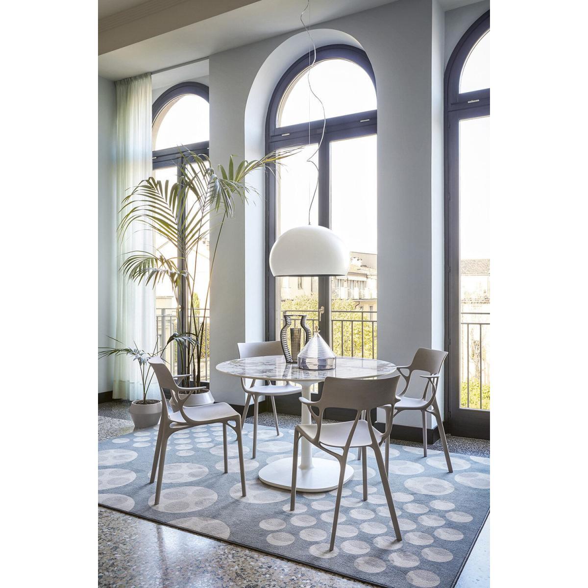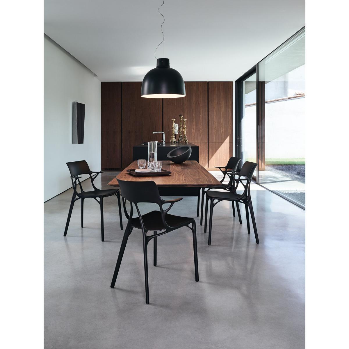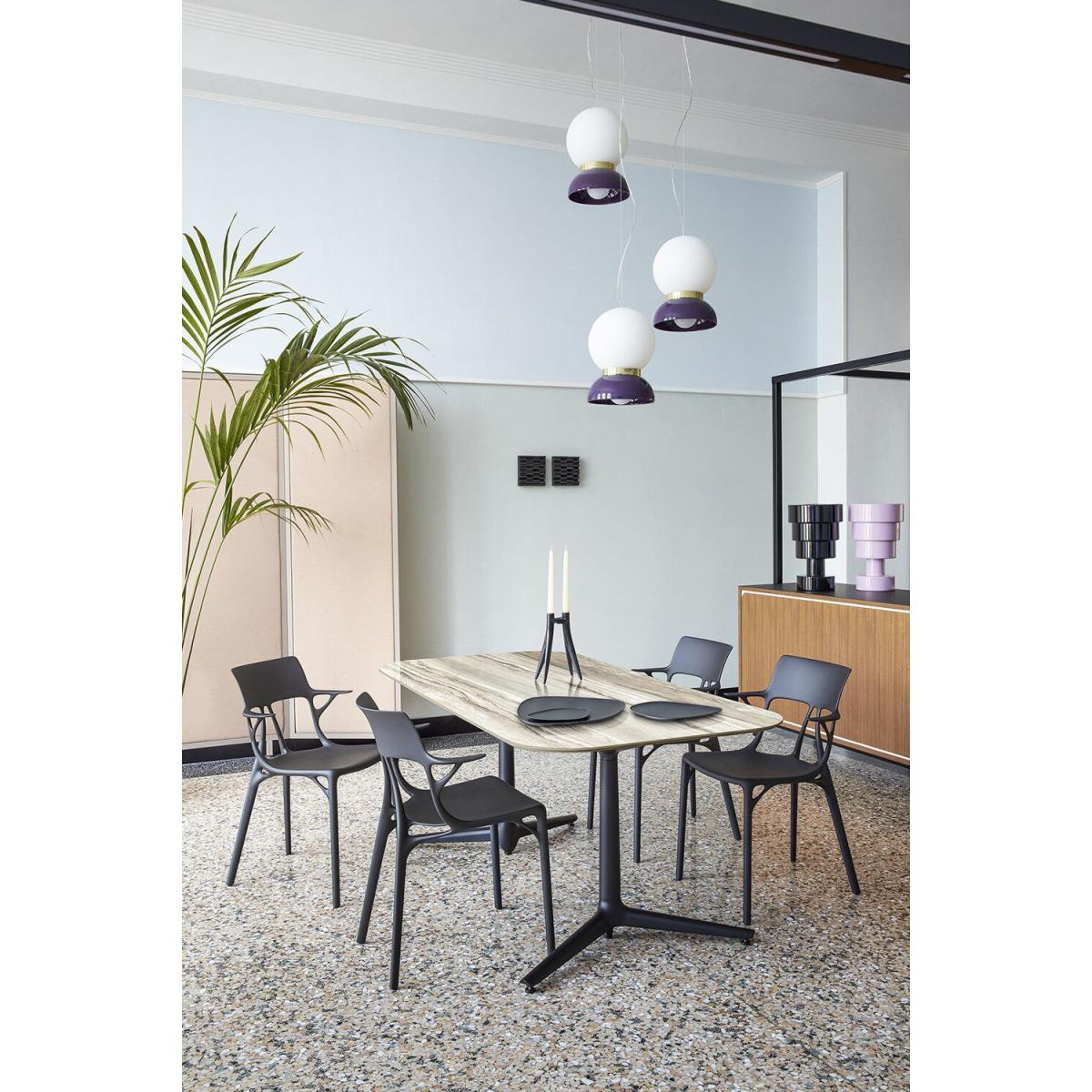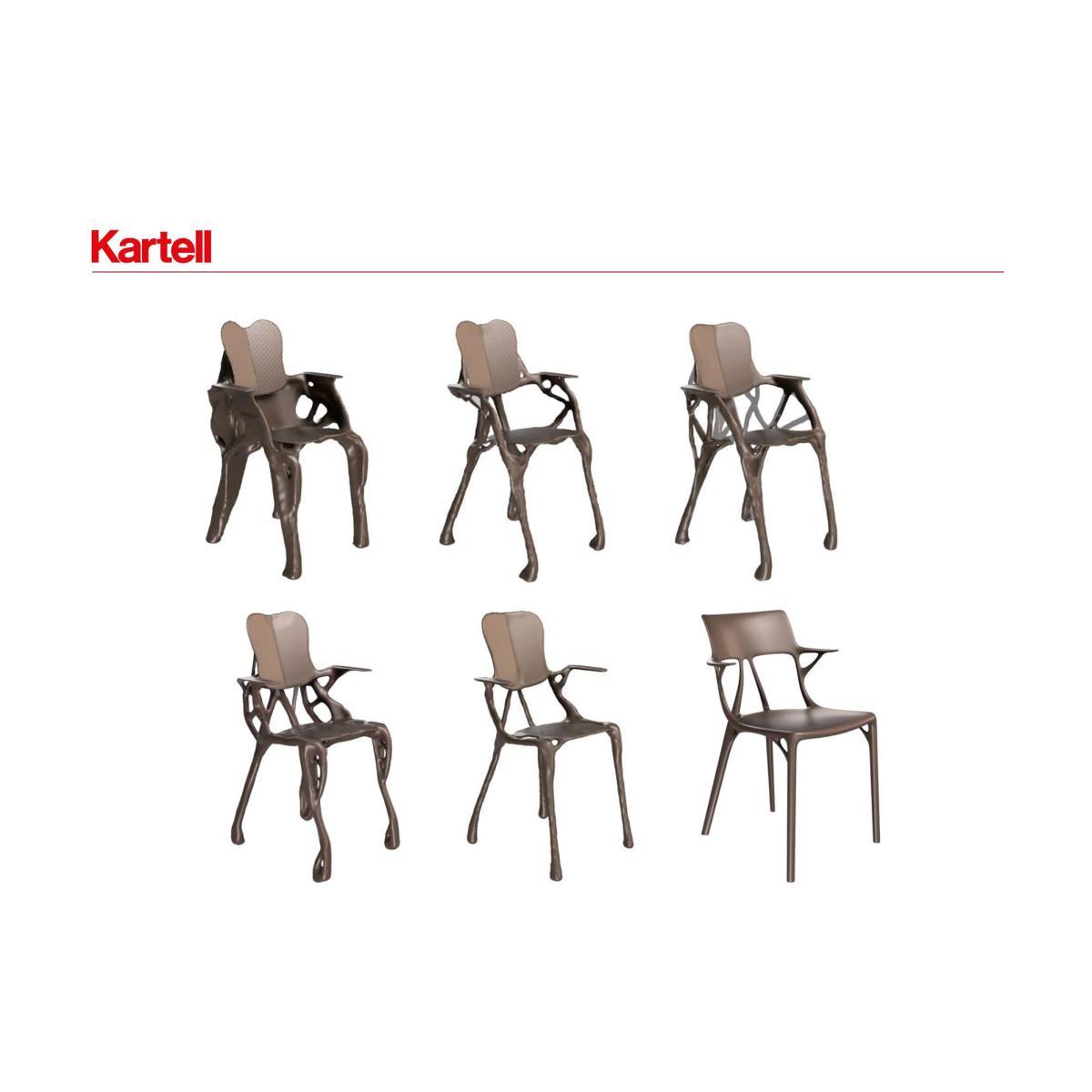 Precious. The A. I armchair shines with new metallic finishes which enhance the design. The plastic becomes noble and sophisticated, granting a luxurious and glamorous dimension to Kartell best sellers. The future is taking shape at Kartell. Pioneer and visionary, the famous designer, Philippe Starck, continues to innovate: he has created the first chair designed by artificial intelligence. To draw it, Starck used Autodesk, an American company specialised in 3D design software. To design the A. I. (Artificial Intelligence) chair, Philippe Starck, Autodesk and Kartell asked a single yet crucial question of Dreamcatcher (the generative design software developed by Autodesk): "Would you be able to give our bodies a rest by using as little materials and energy as possible? With no culture, memories or influence, the software only responded with intelligence, its "artificial" intelligence. " A. I. Is the first chair designed outside of our brains, outside of our ways of thinking. Human creative thought and artificial intelligence therefore merged to design a chair made completely by an algorithm which meets the original requirements: creating a comfortable, study chair in line with the Kartell collections' aesthetics, with as little material and energy as possible. The A. I. Chair is the result of joint work between artificial and human intelligence, defined by Starck himself as "Natural intelligence". Autodesk stated that the design process with the artificial intelligence software was reminiscent of ""a child learning’’. Starck described this process as very similar to a conversation between two human beings. "Why do chairs all look like each other? How can you create a structurally different chair? At a point, I needed to open a new door. " explained Philippe Starck concerning the creation of the A. I. Chair project. This collaboration between human and artificial intelligence has shown that artificial intelligence can assist the work of a designer by calculating what the optimal responses are to a design idea. The A. I. Chair is a symbol of the experimental approach of design and the ecological involvement of the designer Philippe Starck. "Coming from elsewhere, a new world is now open to us. An unlimited world. " concluded Starck. No doubt the A. I. Chair marks a turning point for the future of design. Mark Davis, Design Futures Director of Autodesk, stated: "Working with Starck and Kartell was really a source of inspiration. The opportunity to understand their design philosophy and their approach to solving problems was invaluable for our team, in the context of our reflection on the future of manufacturing. It is a research collaboration at the height of industrial design, which was able to obtain one of the most creative results that we have tried to achieve with generative design. Thanks to a collaborative relationship with artificial intelligence, humans will see their expertise in terms of design and engineering amplified, which will increase their capacity for innovation and productivity. " Pursuing its technological research, Kartell continues to innovate to select new materials that perform increasingly well and are ever more environmentally friendly. The A. I armchair is made from a 100% recycled thermoplastic technopolymer, coming from industrial waste. With this material, Kartell is making new inroads into environmental sustainability, by using recycled materials, while ridding the environment of waste which is turned back into raw materials, therefore triggering a virtuous cycle of the circular economy.