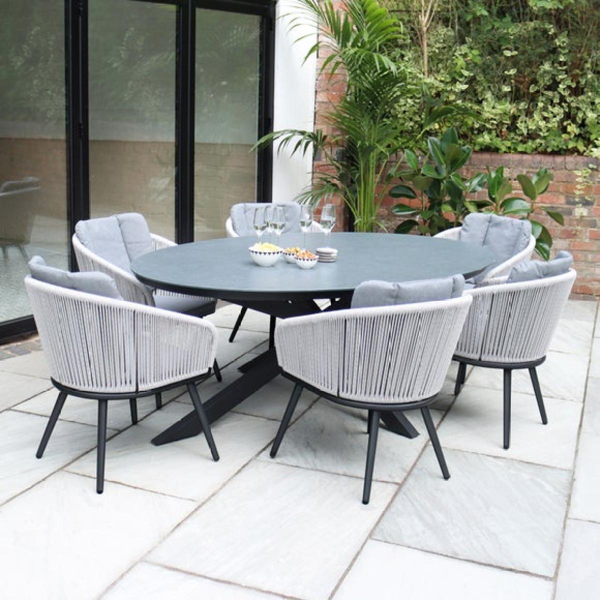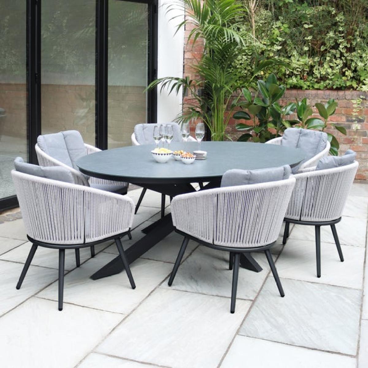 * Large ceramic table top * Rattan style rope chairs * 6 matching chairs Host larger outdoor gatherings with the Aspen 200cm oval dining set, blending sleek grey ceramic with six beautifully woven rope chairs. Built for both comfort and durability, this generously sized set makes a sophisticated focal point for summer parties, family dinners, or simply stretching out with a glass of something chilled.