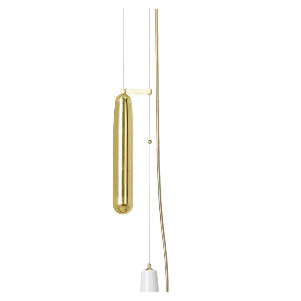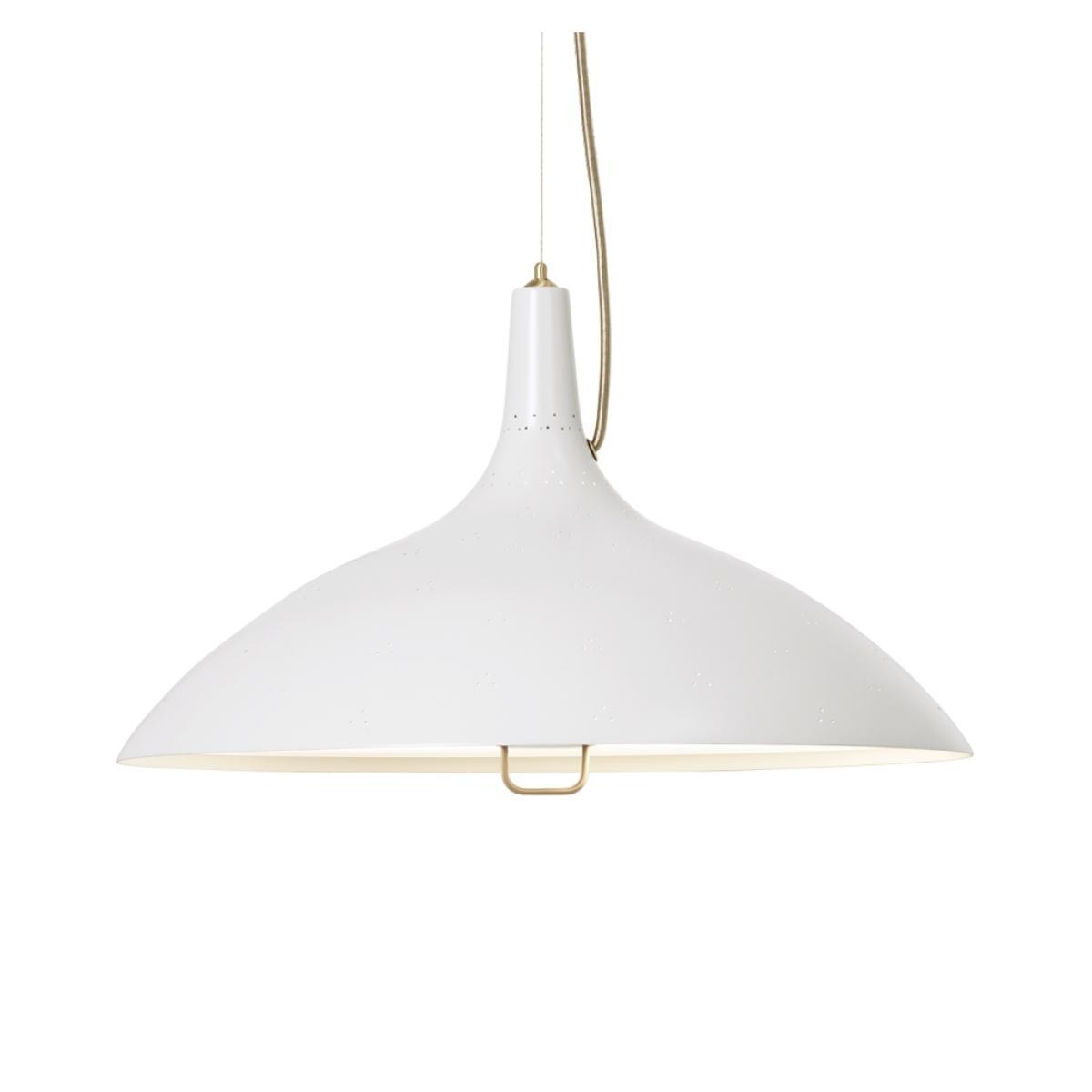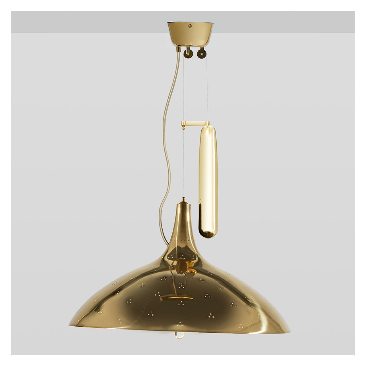 An iconic design conceptualised in 1948 by Finnish designer Paavo Tynell, the brass A1965 Pendant Light is expertly crafted by Gubi. Originally designed for New York's Finland House to showcase Finnish design, the statement pendant lampshade is characterised by its perforated triangular pattern that helps to cast a soft, diffused glow across the room. Boasting elegant brass accents, the A1965 Pendant Light features a brass counterweight to adjust the height of the light to suit any space and a matte glass diffuser to gently illuminate without glare. Renowned for his influence on modern lighting design, Paavo Tynell originally trained as a blacksmith before founding his own metalwork and lighting studio in 1918. With a simplified aesthetic, his pieces echo influences from mid-century modernism, showcasing counterweighted suspension mechanisms and beautiful complementary materials in appealing forms. Requires: 1 x Max 46W E27 bulb (not included)