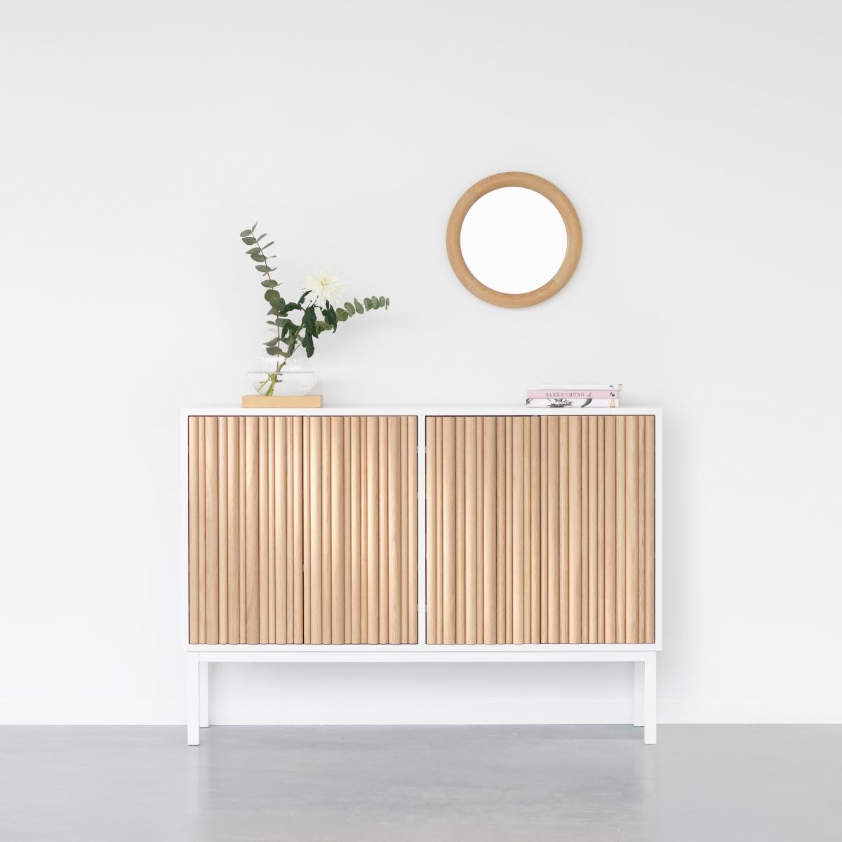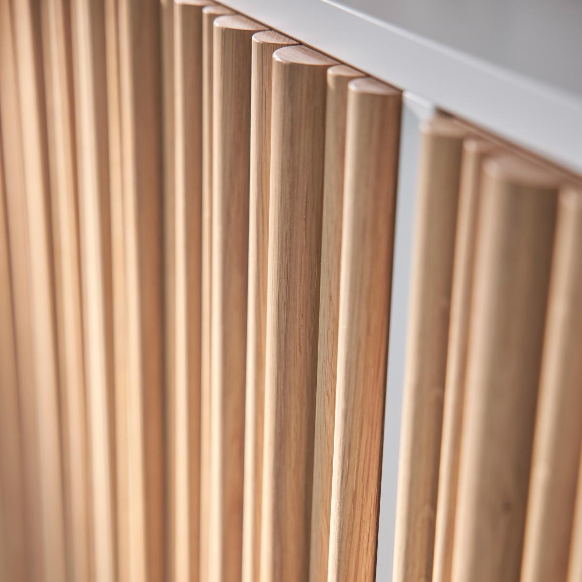 I love this sideboard because of its clean, contemporary design combined with natural oak detailing, which adds warmth to any room. The white oiled oak finish makes it versatile, working well in Scandi-inspired interiors, minimalist spaces, or even a modern, cosy living room. Practical styling tips include pairing it with neutral or pastel accessories for a fresh look or layering with textured ceramics and metallic accents for added interest. Its sleek yet functional design makes it ideal for storing tableware, position it against a light wall to highlight the natural wood slats, and consider adding decorative lamps or artwork on top to create a focal point.
