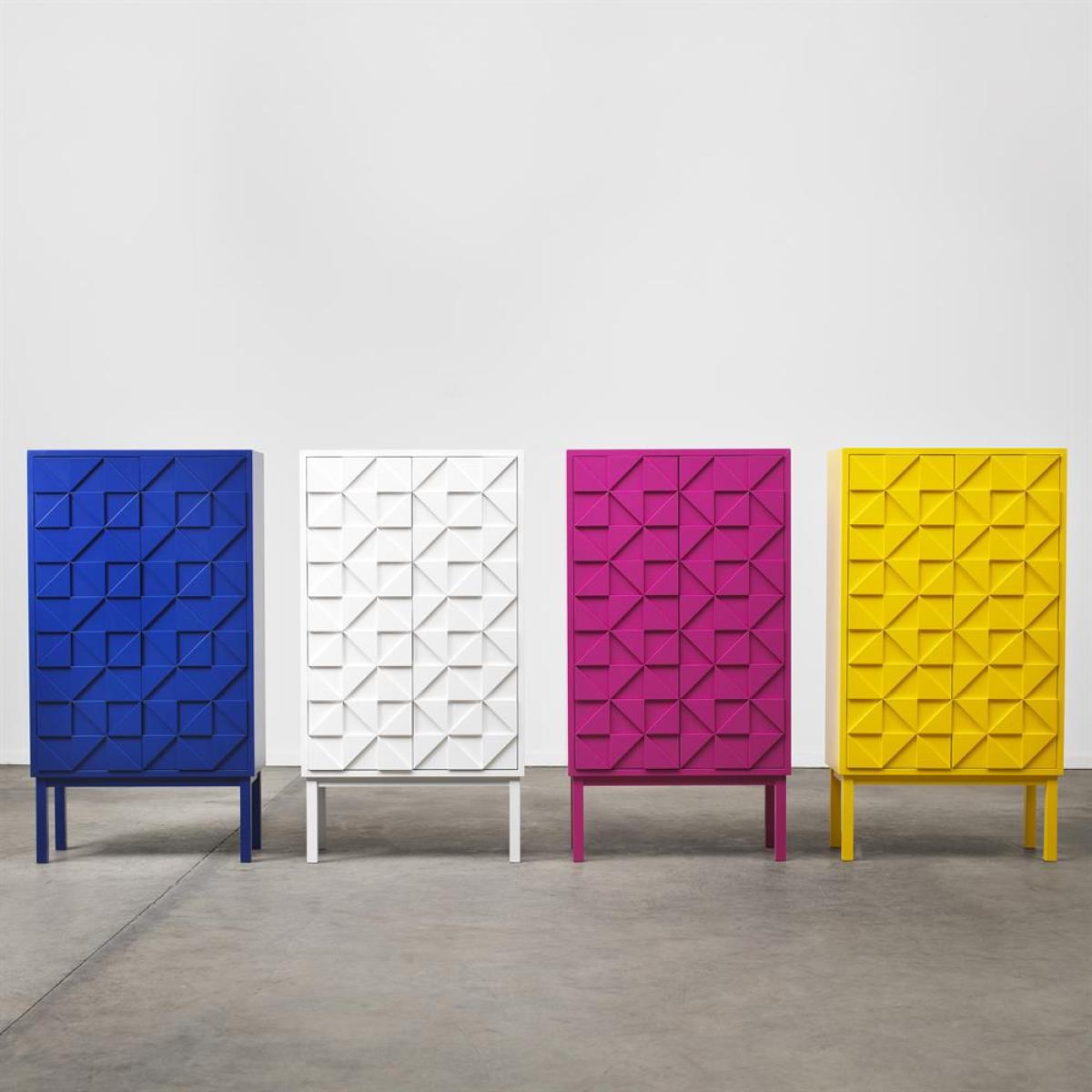 Collect cabinet 2011 is the new member of the Collect cabinet family that is the follow-up to the original colourful Collect cabinet and the white Collect 2010 cabinet. Collect 2011 is colourful and characterised by its interesting doors with a pattern of triangles in two levels. Choose from four colorful designs, white, blue, yellow and cerise.