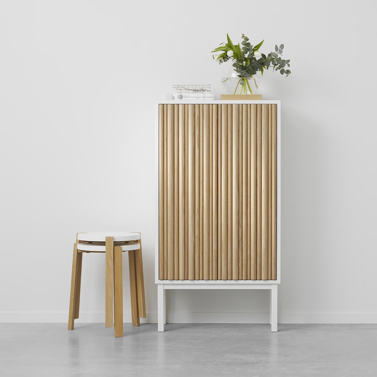 The A2 Collect cabinet is a modern piece that blends functionality with sleek design, making it a versatile addition to various interiors. I love its clean lines and the contrast between the oak finish and white legs, which add a contemporary touch while maintaining warmth. It works particularly well in minimal or Scandinavian-inspired spaces, where its understated silhouette can be highlighted with simple decorative accessories. For styling, consider pairing it with neutral tones or textured objects on top to create visual interest without clutter. Its height and depth make it ideal for storing essentials discreetly, while the slatted oak front injects subtle texture that can beautifully complement other natural materials in the room.