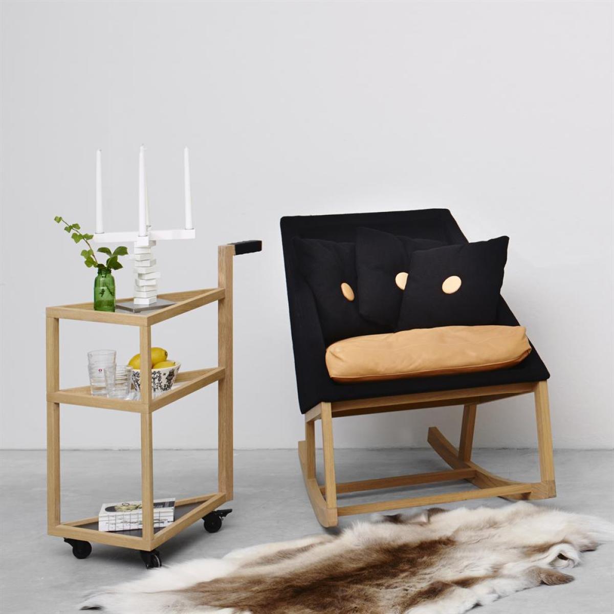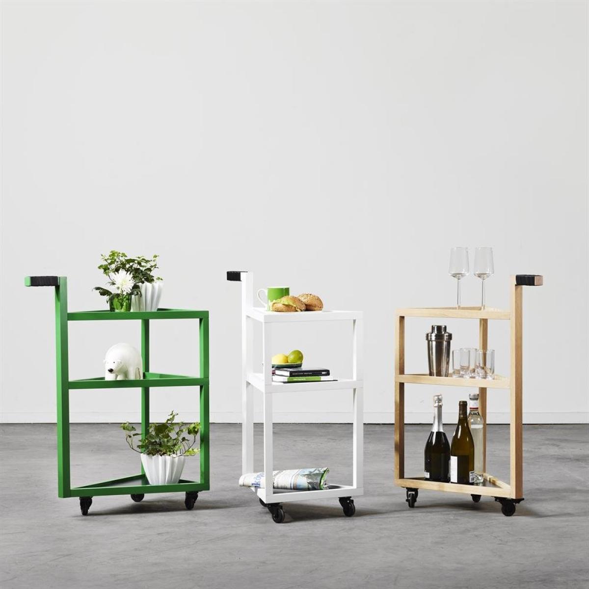 Move trolley comes with a triangular shape and a distinct handle that makes a nice little character that catches the eye. Use it as a small table next to the sofa or bed, as a drinks trolley or as just as a movable table. The trolley has black wheels and the handle is covered in black leather.