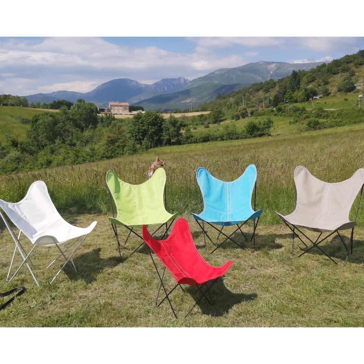 The legendary AA Butterfly armchair is available in a new Batyline canvas, even more resistant to bad weather (resistant to sun, rain, sea, etc. ). Rot-proof and waterproof, this washable canvas is easy to look after. Timeless and legendary, the Butterfly armchair was created in 1938 by architect-designers Jorge Ferrari-Hardoy, Juan Kurchan and Antonio Bonet, Butterfly. It has survived the changing times and styles to become a classic inscribed into the collective memory. A true icon, it has been part of the permanent collections of MoMa since 1944. This armchair is clearly inspired by the Modern movement illustrated in France by the work of Le Corbusier: extreme sobriety, geometric, functional lines, use of steel etc. The AA Butterfly armchair consists of a painted steel tube frame onto which an interchangeable canvas or leather cover is threaded. The AA Butterfly armchair subtly combines form and function in an elegant marriage of minimalism and efficiency. A true invitation to laze around, AA Butterfly is ideal for setting up a relaxation area that’s perfect for long discussions in your living room or garden. As the cover of the AA Butterfly armchair is removable, you can buy interchangeable covers separately to alter the look of your armchair in the blink of an eye! An AA Butterfly certificate is delivered with the structure with a reference number. Made in France, this high-end reissue scrupulously respects the spirit and quality of the original model designed in 1938. AA Butterfly is the registered trademark name of AA New Design.