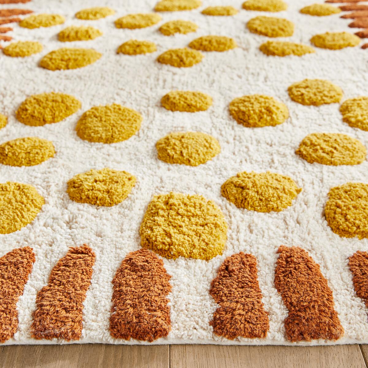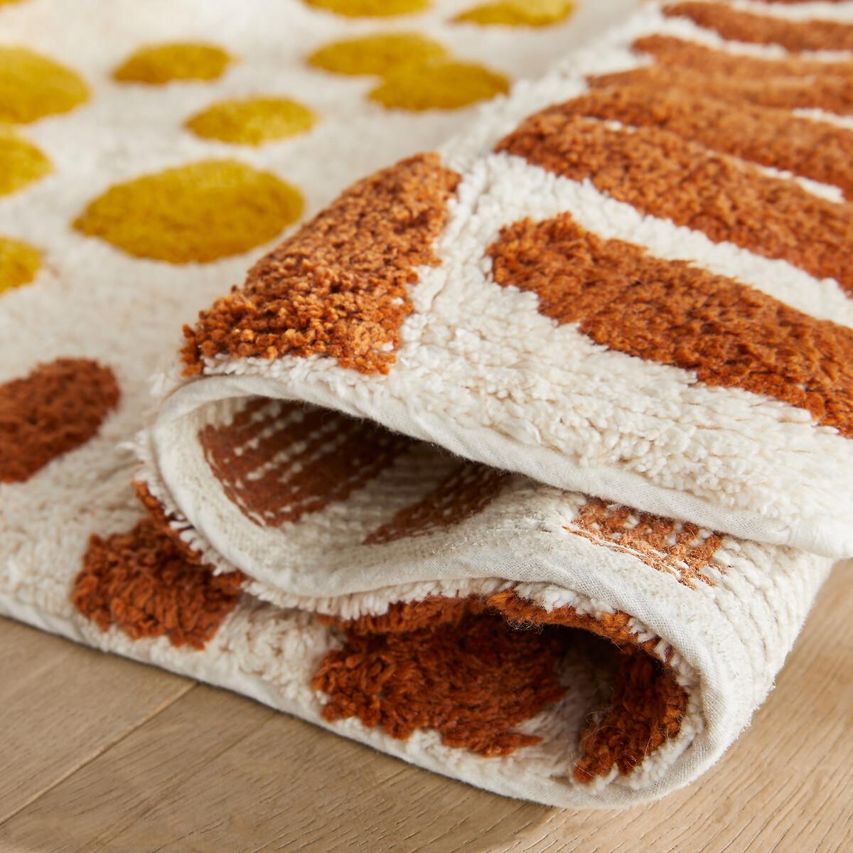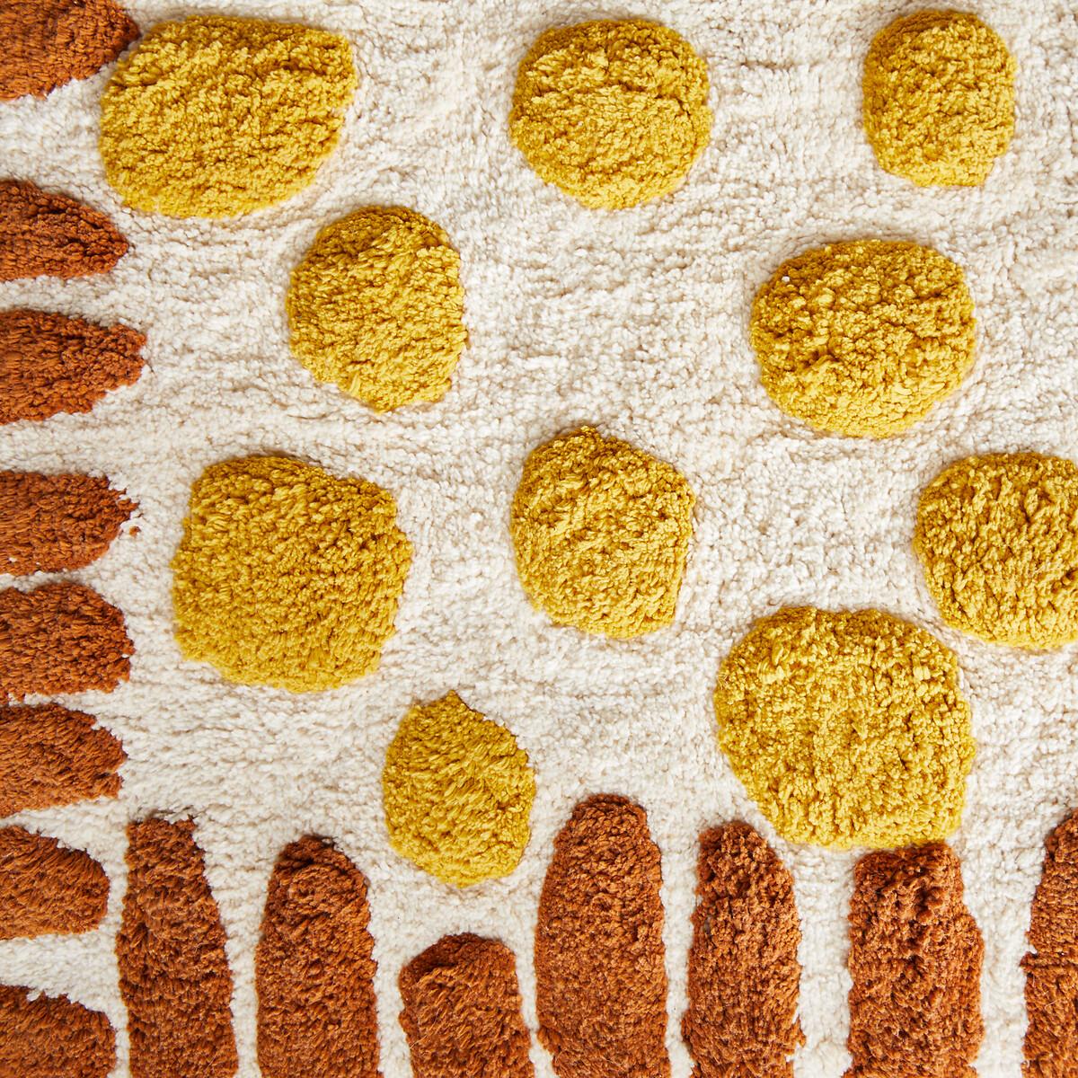 I love this little rug for its playful yet natural look, making it a versatile addition to any child's space or nursery. The organic cotton material adds a soft, breathable texture perfect for little feet, while the bright yellow and warm terracotta tones bring a cheerful, colourful touch. It works well in a variety of interiors, from modern Scandinavian schemes to more eclectic or boho styles, giving a fun focal point without overwhelming the room. For styling, consider layering it over a plain wooden or neutral carpet to highlight its pattern or incorporating matching accessories like cushions or curtains in similar colours for a cohesive look. Its compact size makes it ideal for beside beds or cribs, adding a cosy feel while remaining practical and easy to clean.