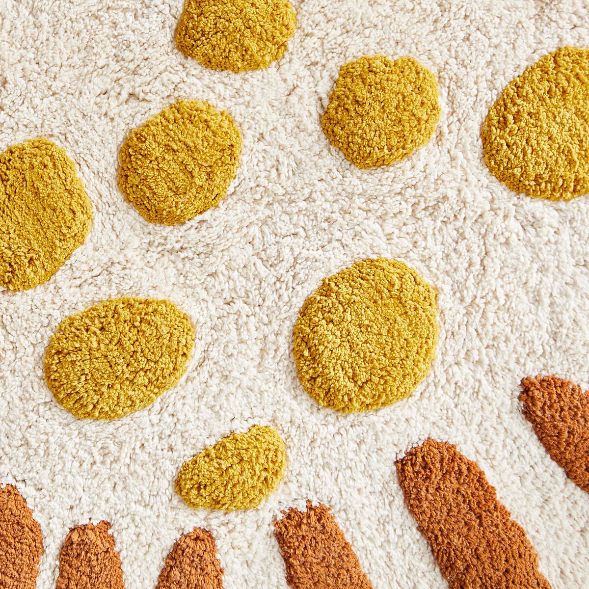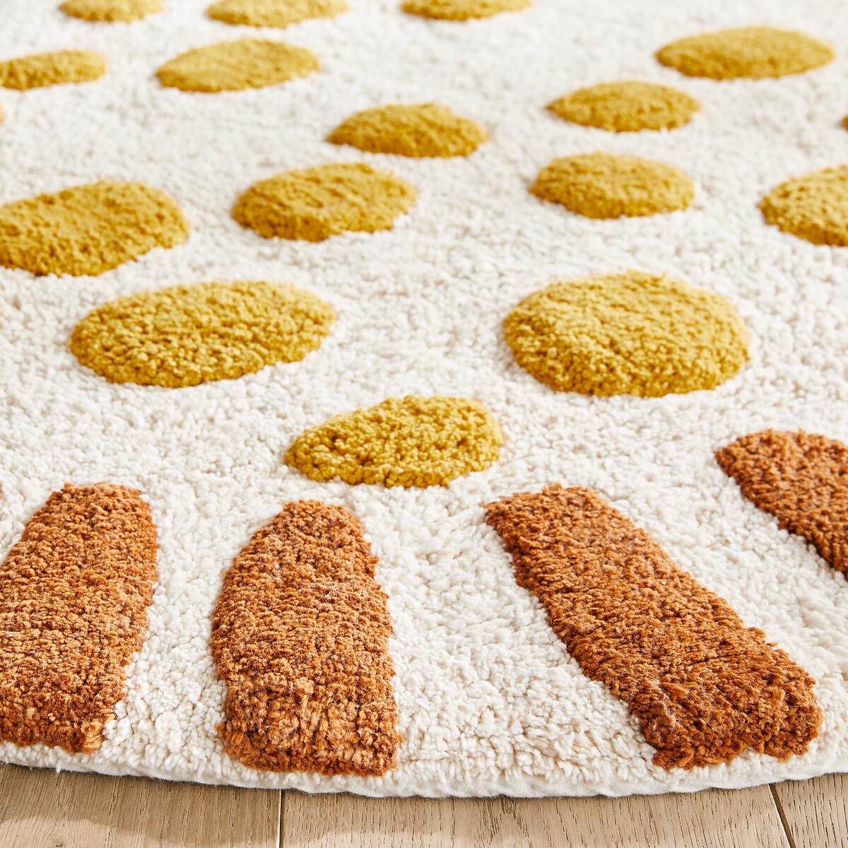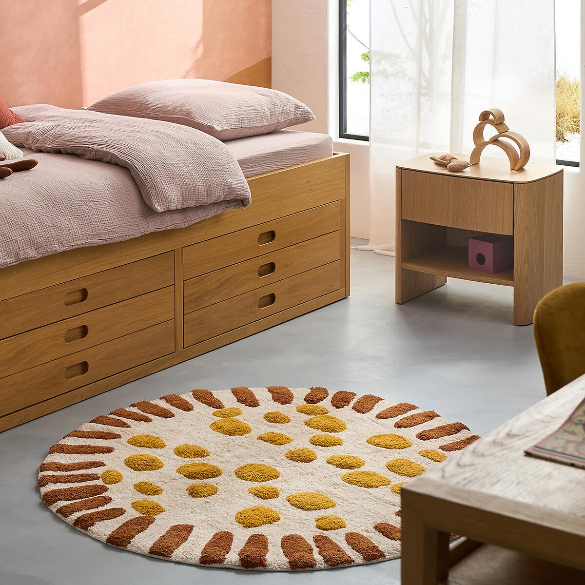 I’m a fan of this round organic cotton rug for its gentle low pile and natural fibres - perfect for sensitive little feet. The cheerful sunburst-inspired pattern in muted ochre and terracotta sits well against pale walls or pale wood floors, making it a versatile pick for Scandi-style nurseries, boho-chic playrooms or a modern kids’ bedroom. For styling, use it to zone a reading nook or play area: layer over a larger neutral floor covering or pair with simple wooden toy storage and textured floor cushions. Its machine-washable cotton face means you can tackle spills in a flash, so it looks good and stays practical in a busy family home.