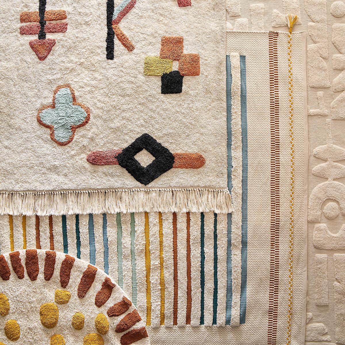 Aarav, a round rug with a soft, fluffy and thick feel. Its brightly coloured patterns on a natural colour background recall the irregular spots of animal fur..