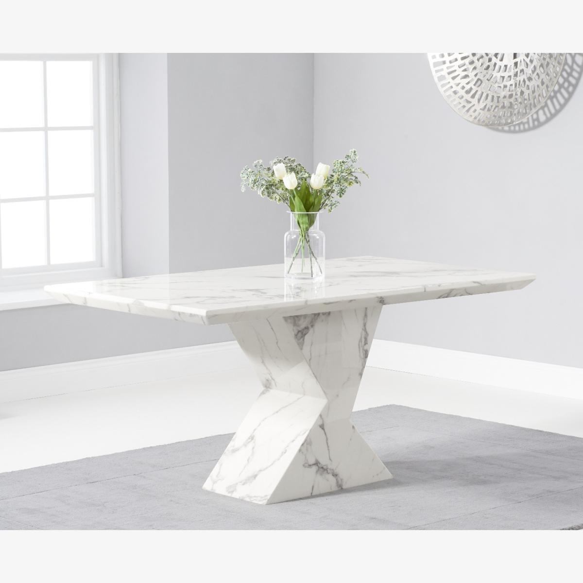 I’m a fan of this marble-white dining table for its clean lines and sturdy sculptural base - it slots straight into minimalist, Scandi or contemporary schemes. Keep styling simple with neutral linen runners or round rattan placemats, a few clear glass vases and some fresh greenery to add warmth without clutter. Pair it with slim-legged chairs in muted velvet or leather for contrast, and protect the surface with discreet coasters or heat-resistant mats when you’re serving hot dishes.