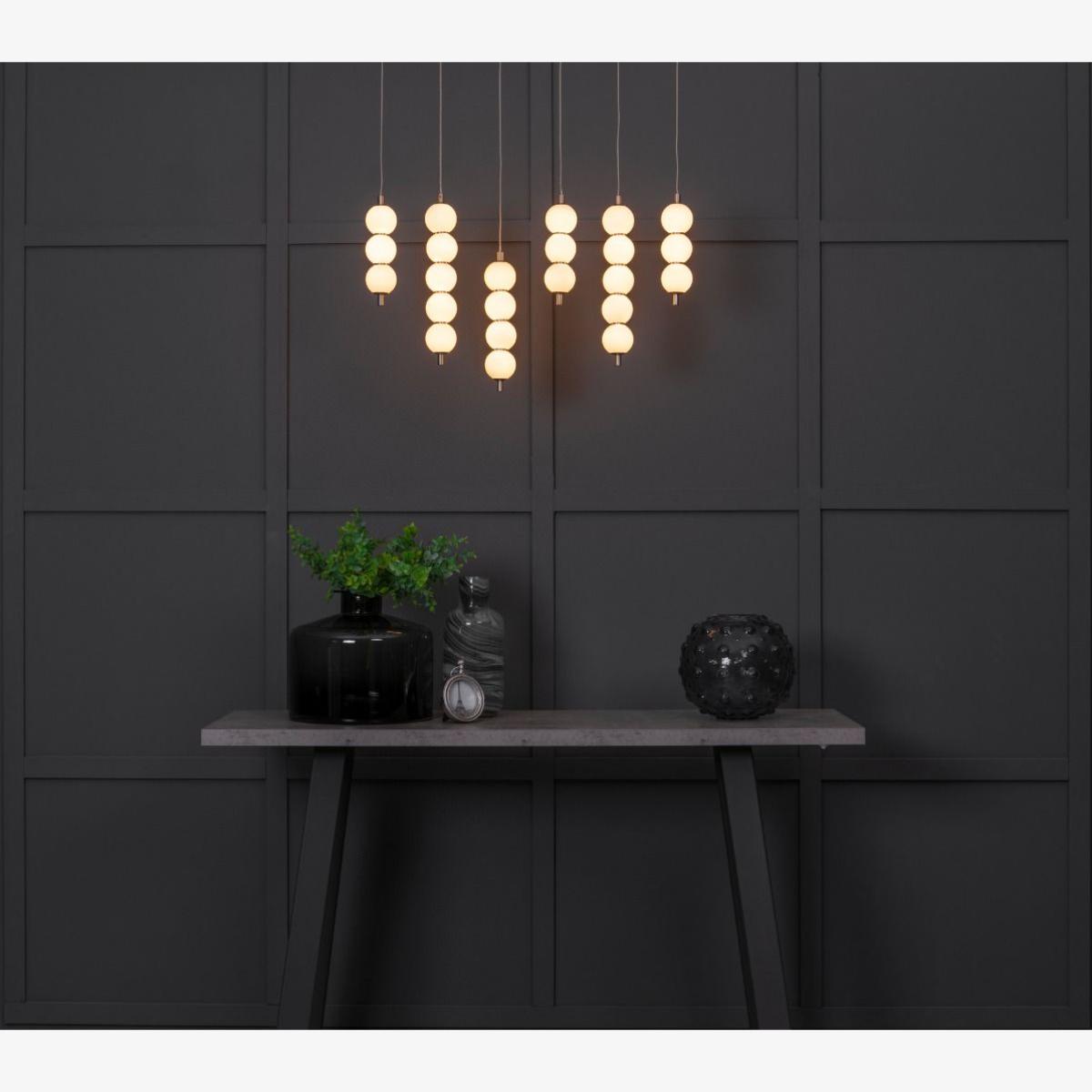 Amazing unique LED pendant ceiling light This contemporary bar-style LED fitting is constructed from a single bar plate. Finished in satin nickel, the six opal led lights are suspended at different levels from the fine silver cable. Each light resembles a stack of opal beads. This would create a stunning centrepiece over any dining area. Amazing unique LED pendant ceiling light This contemporary bar-style LED fitting is constructed from a single bar plate. Finished in satin nickel, the six opal led lights are suspended at different levels from the fine silver cable. Each light resembles a stack of opal beads. This would create a stunning centrepiece over any dining area.