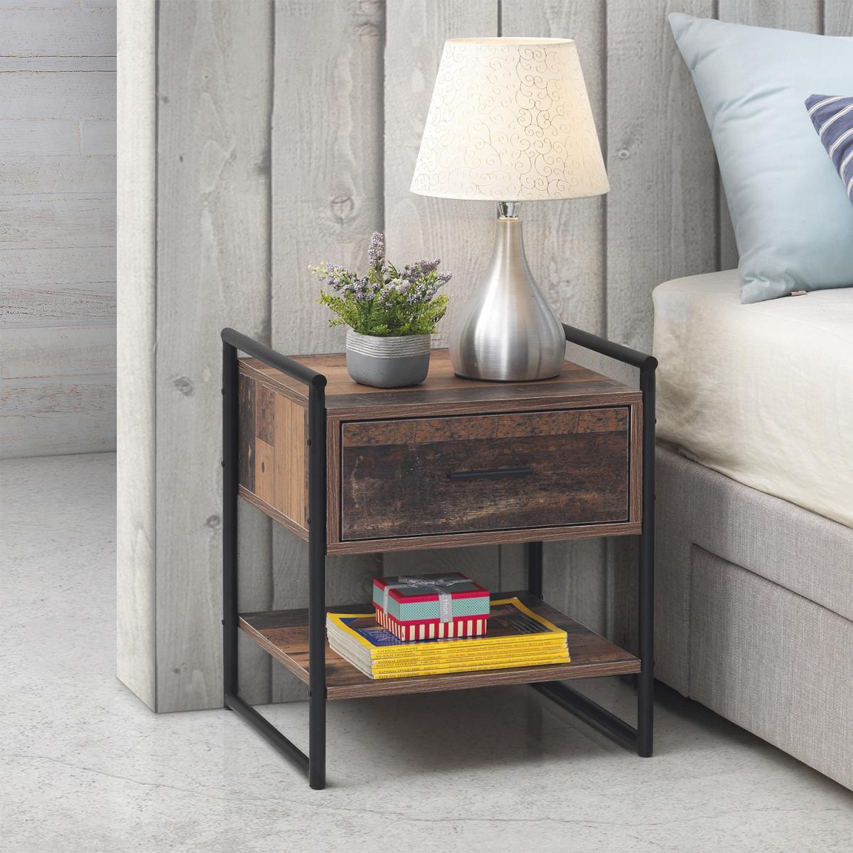 I’m a fan of this rustic bedside table because its mix of oak-effect wood and slim black metal frame brings both warmth and structure without feeling bulky. It suits industrial, Scandinavian or modern farmhouse schemes, pairing neatly with neutral bedding, textured throws and black-iron accents. For styling, keep the top surface clear with a small lamp and a potted plant or a couple of framed photos, use the drawer for chargers or journals, and organise books or a woven basket on the lower shelf to maintain a tidy, lived-in look.