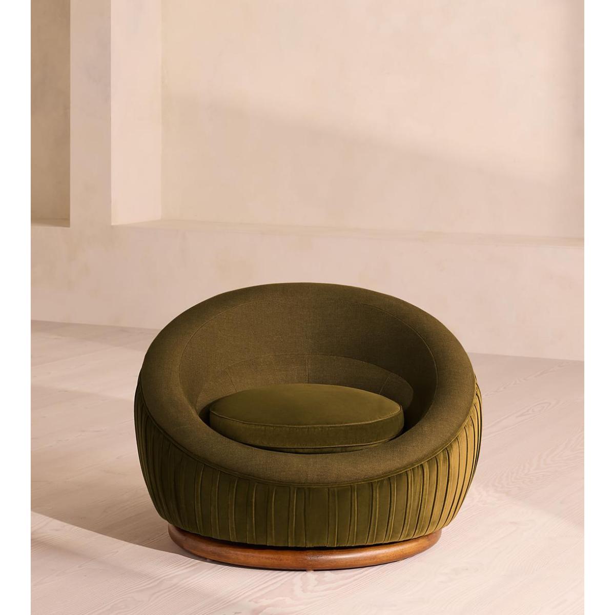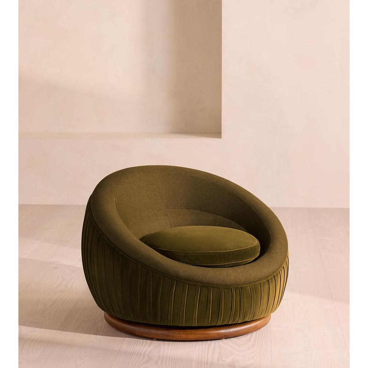 I love this armchair for its bold yet versatile design. The combination of olive velvet and linen gives it a rich texture that works beautifully in both contemporary and vintage-inspired interiors. It sits well in living rooms, bedrooms, or even alongside a reading nook as a statement piece. To style it effectively, consider pairing with neutral or warm-toned accessories to let the olive hue stand out, or add patterned cushions for a bit of contrast. Its rounded shape and cosy appeal make it ideal for creating an inviting and intimate seating area, especially in spaces where comfort meets style.