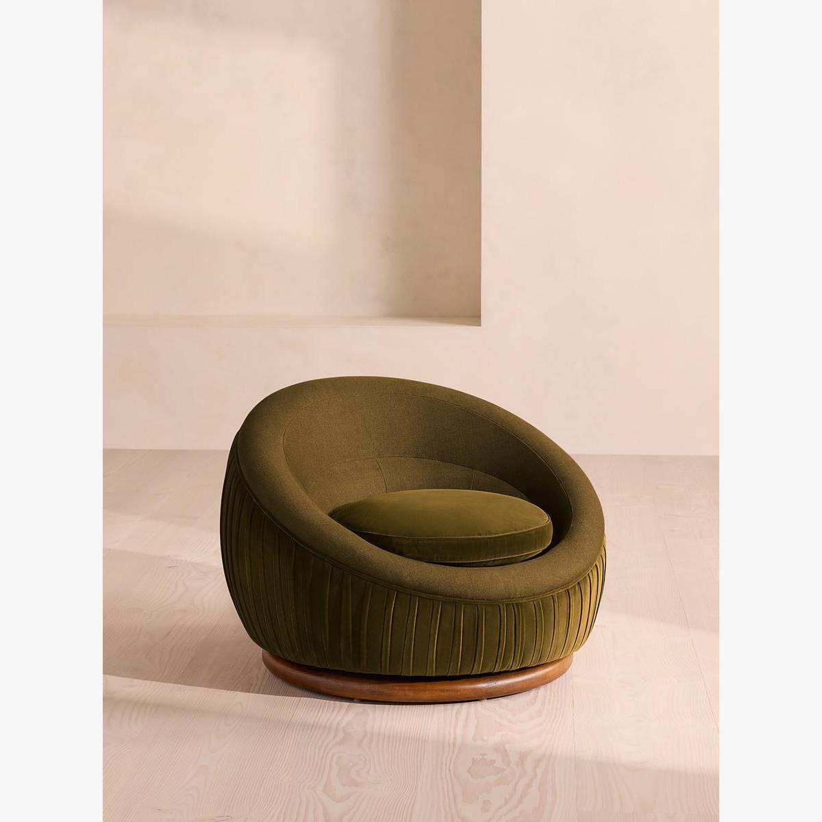 Characterised by a curved shape that sits on a swivel base carved from solid oak. Fully upholstered in a mix of linen and velvet with a fluted base and tonal piping, the Abel armchair is characterised by comforting curves that take inspiration from 180 House.