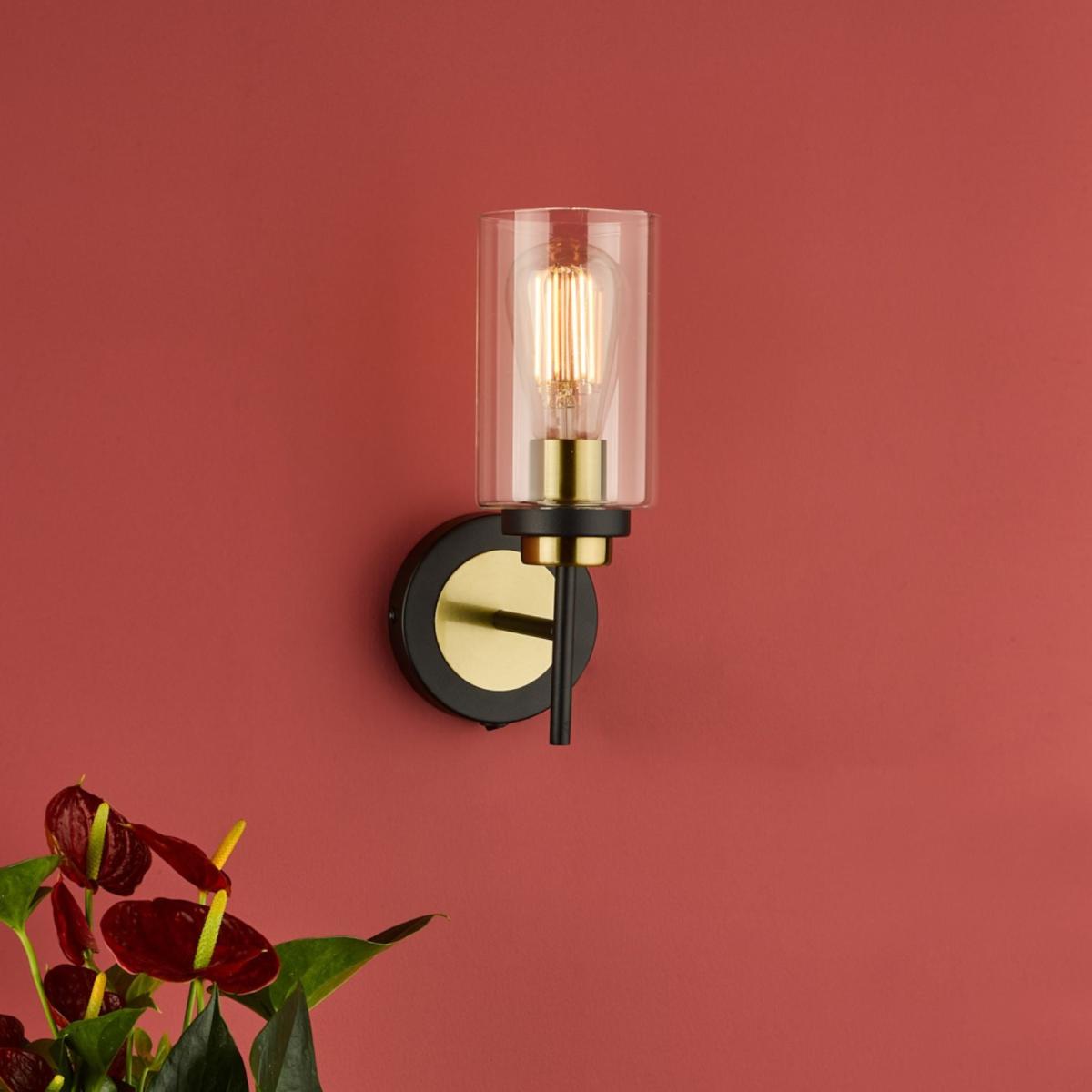 Abel 1-light wall light, featuring a matte black finish with satin brass detailing, a slender arm and a clear glass cylindrical shade. The Abel wall light is a sleek and sophisticated fixture that effortlessly blends modern elegance with a touch of industrial charm. Featuring a matte black finish accented with satin brass detailing, this striking wall light showcases a slender, refined arm that extends gracefully from its base. At its centre, a clear glass cylindrical shade allows the light to shine freely, creating a warm yet contemporary ambiance. The combination of contrasting finishes enhances its timeless appeal, making it a versatile choice for a variety of interior styles, from modern minimalist to industrial-inspired spaces. Ideal for hallways, bedrooms or living areas, the Abel wall light adds a subtle yet stylish statement, whether used as an individual accent or paired for symmetry. Its open glass design works beautifully with filament or vintage-style bulbs, adding further character and charm to any room. Abel 1-light wall light, featuring a matte black finish with satin brass detailing, a slender arm and a clear glass cylindrical shade. The Abel wall light is a sleek and sophisticated fixture that effortlessly blends modern elegance with a touch of industrial charm. Featuring a matte black finish accented with satin brass detailing, this striking wall light showcases a slender, refined arm that extends gracefully from its base. At its centre, a clear glass cylindrical shade allows the light to shine freely, creating a warm yet contemporary ambiance. The combination of contrasting finishes enhances its timeless appeal, making it a versatile choice for a variety of interior styles, from modern minimalist to industrial-inspired spaces. Ideal for hallways, bedrooms or living areas, the Abel wall light adds a subtle yet stylish statement, whether used as an individual accent or paired for symmetry. Its open glass design works beautifully with filament or vintage-style bulbs, adding further character and charm to any room.