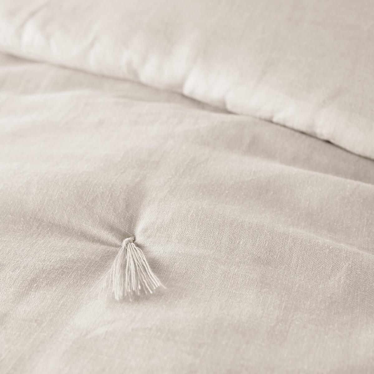 Authentic and timeless. The Abella washed linen quilt brings a touch of elegance to the bedroom. A fresh material in summer and comfortable in winter, washed linen becomes softer and more beautiful with every wash.. Slightly wrinkled, ironing is unnecessary. Product Details • Cover: 100% washed linen • Padding: 100% polyester (400g/m²) • Lightweight tassel padding • Edge-to-edge finish. Care Advice • Washable at 40°C • By washing your laundry at 30°C instead of 40°C, you limit energy consumption • Dryer allowed. Dimensions • 90 x 190cm • 150 x 150cm. See all our pre-washed linen items online. • OEKO-TEX® Standard 100. Standard 100 certification by OEKO-TEX® tests textile products for harmful substances via an independent, international label.