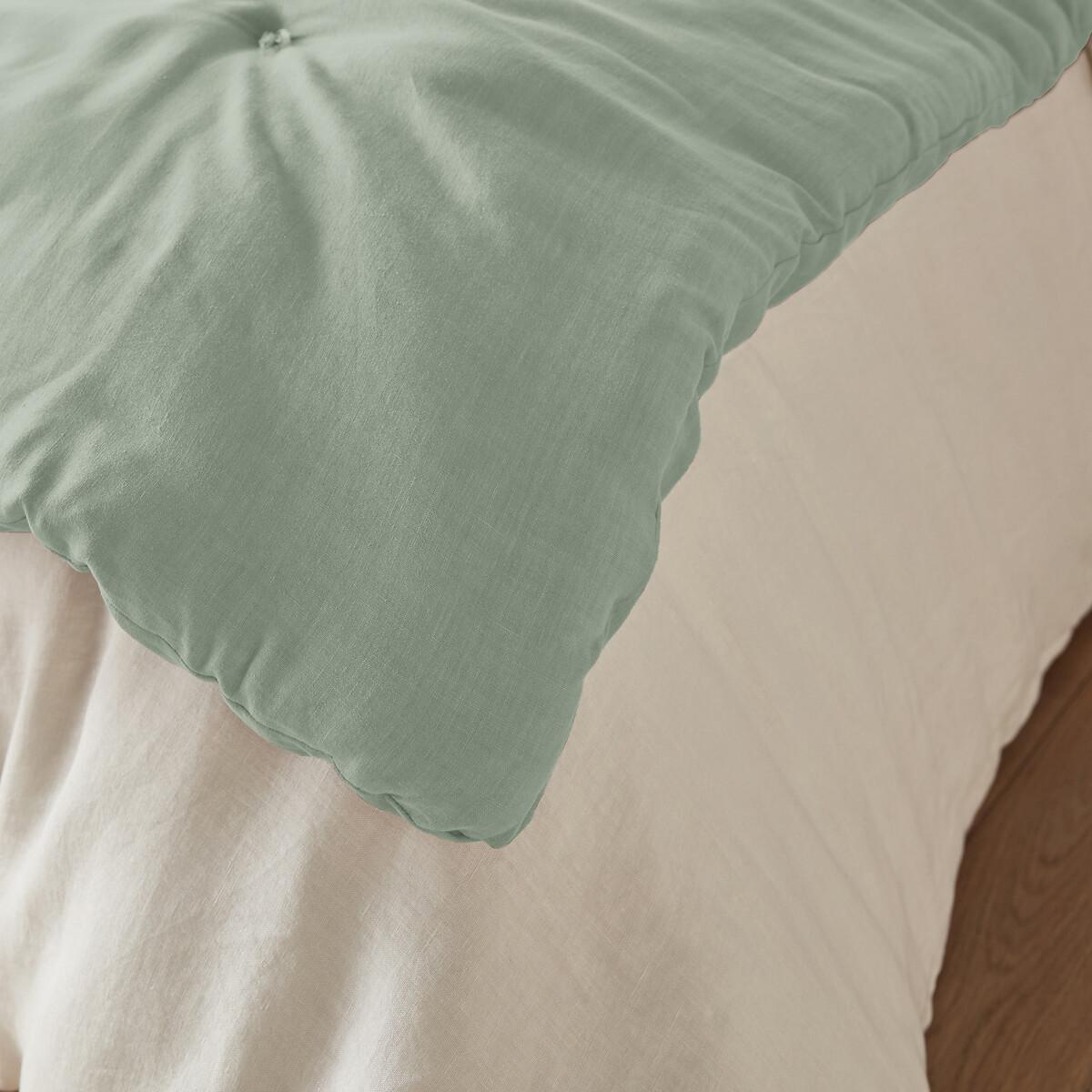 Authentic and timeless. The Abella washed linen quilt brings a touch of elegance to the bedroom. A fresh material in summer and comfortable in winter, washed linen becomes softer and more beautiful with every wash.. Slightly wrinkled, ironing is unnecessary. Product Details • Cover: 100% washed linen • Padding: 100% polyester (400g/m²) • Lightweight tassel padding • Edge-to-edge finish. Care Advice • Washable at 40°C • By washing your laundry at 30°C instead of 40°C, you limit energy consumption • Dryer allowed. Sizes • 90 x 190cm • 150 x 150cm. See all our pre-washed linen items online. • OEKO-TEX® Standard 100. Standard 100 certification by OEKO-TEX® tests textile products for harmful substances via an independent, international label.