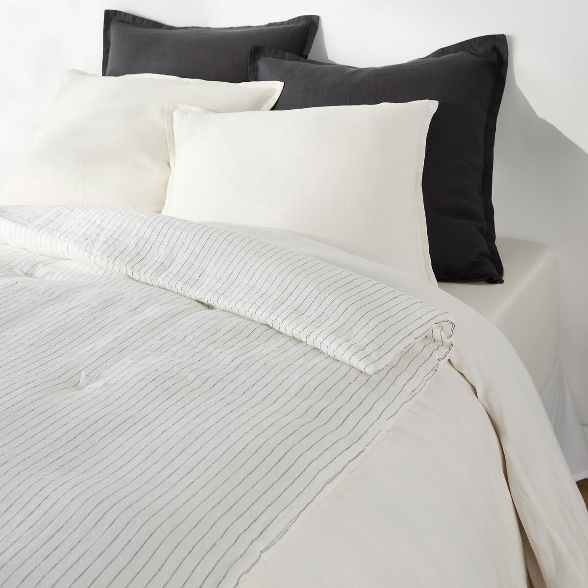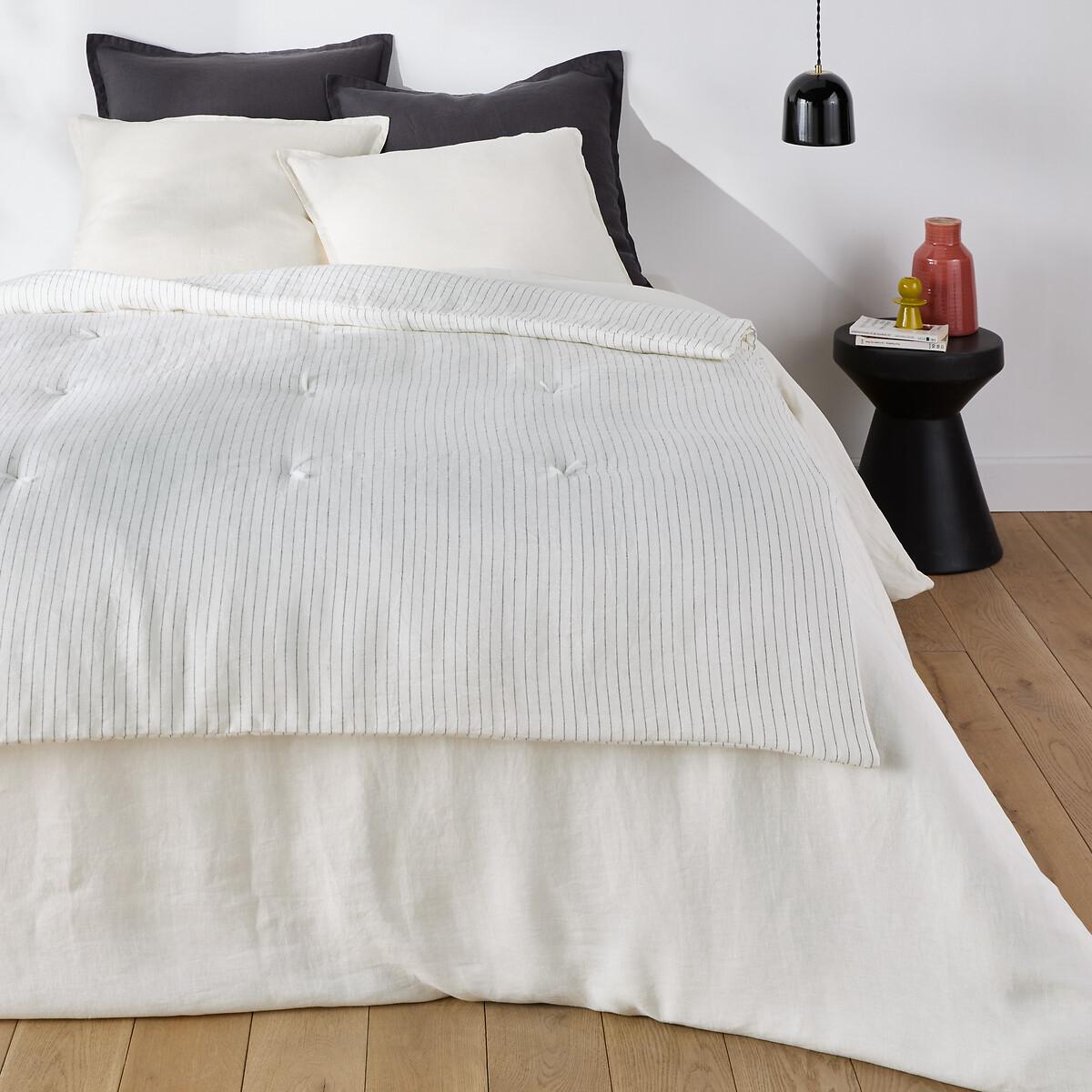 Authentic and timeless. The Abella washed linen quilt brings a touch of elegance to the bedroom. A fresh material in summer and comfortable in winter, washed linen becomes softer and more beautiful with every wash.. Slightly wrinkled, ironing is unnecessary. Product Details • Cover: 100% washed linen • Padding: 100% polyester (200g/m²) • Lightweight tassel padding • Edge-to-edge finish • Striped woven fabric Care Advice • Washable at 40°C • By washing your laundry at 30°C instead of 40°C, you limit energy consumption • Dryer allowed. Dimensions • 90 x 190cm • 150 x 150cm