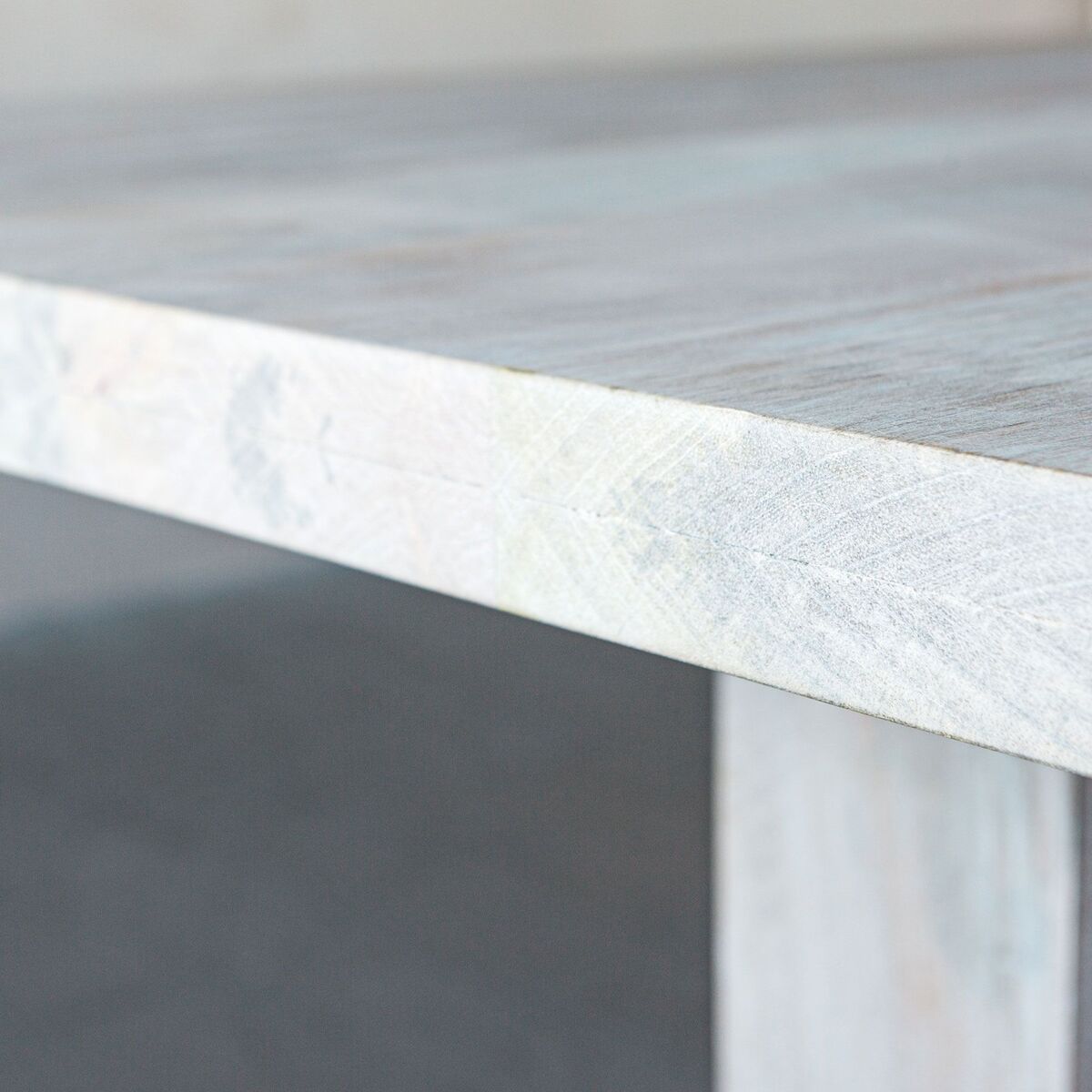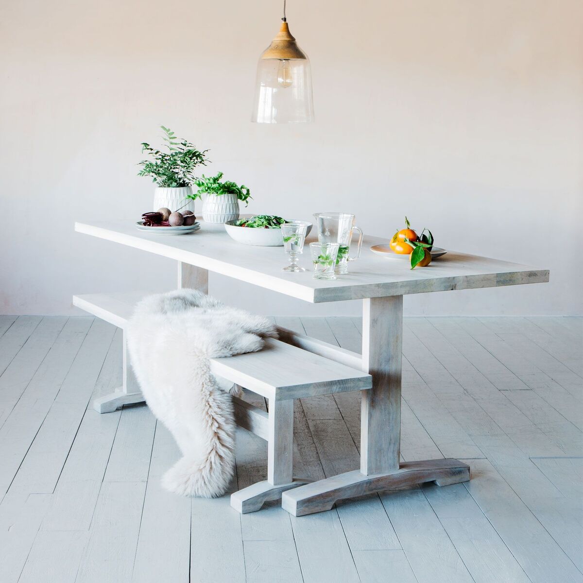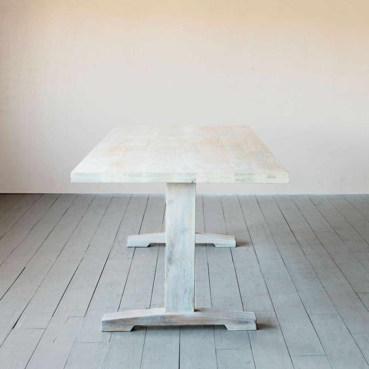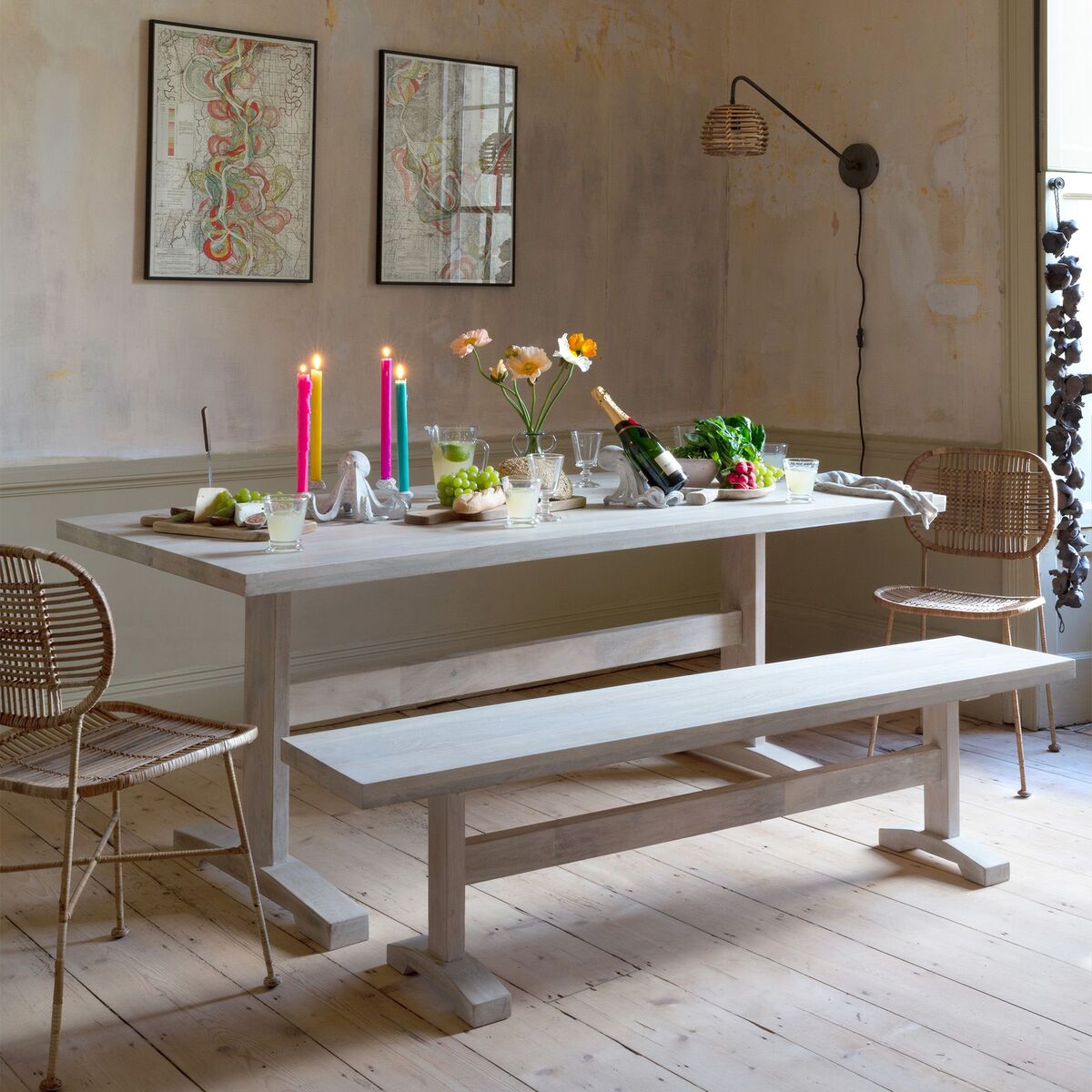 This structural dining table features white washed wood for a refined addition to any interior style, pair with the matching Abelline Dining Bench and cork placemats for a fresh coastal look. H77 x W200 x D90cm. Made of iron and mango wood in a white-wash finish. Weight: 46. 5kg. Some self assembly required. Clean with a soft dry cloth. To prevent watermarks and heat damage, never place items such as ceramics, tableware or glassware directly onto the surface of any of our wooden furniture without the protection of a heat resistant mat, coaster or trivet. Clean up any spillages immediately to avoid staining.