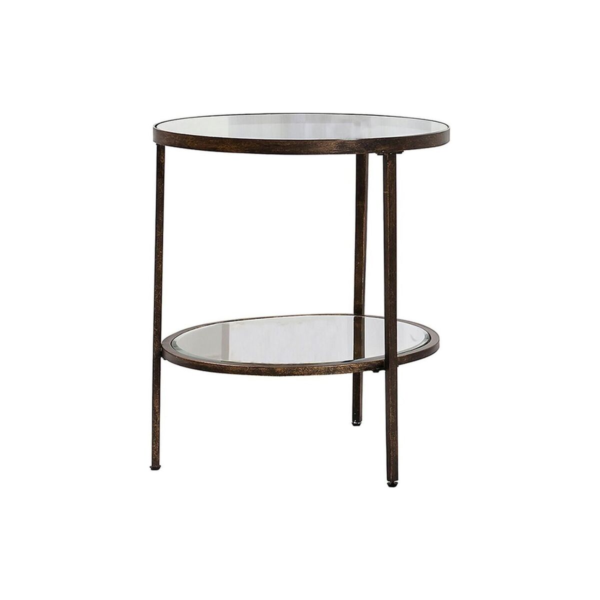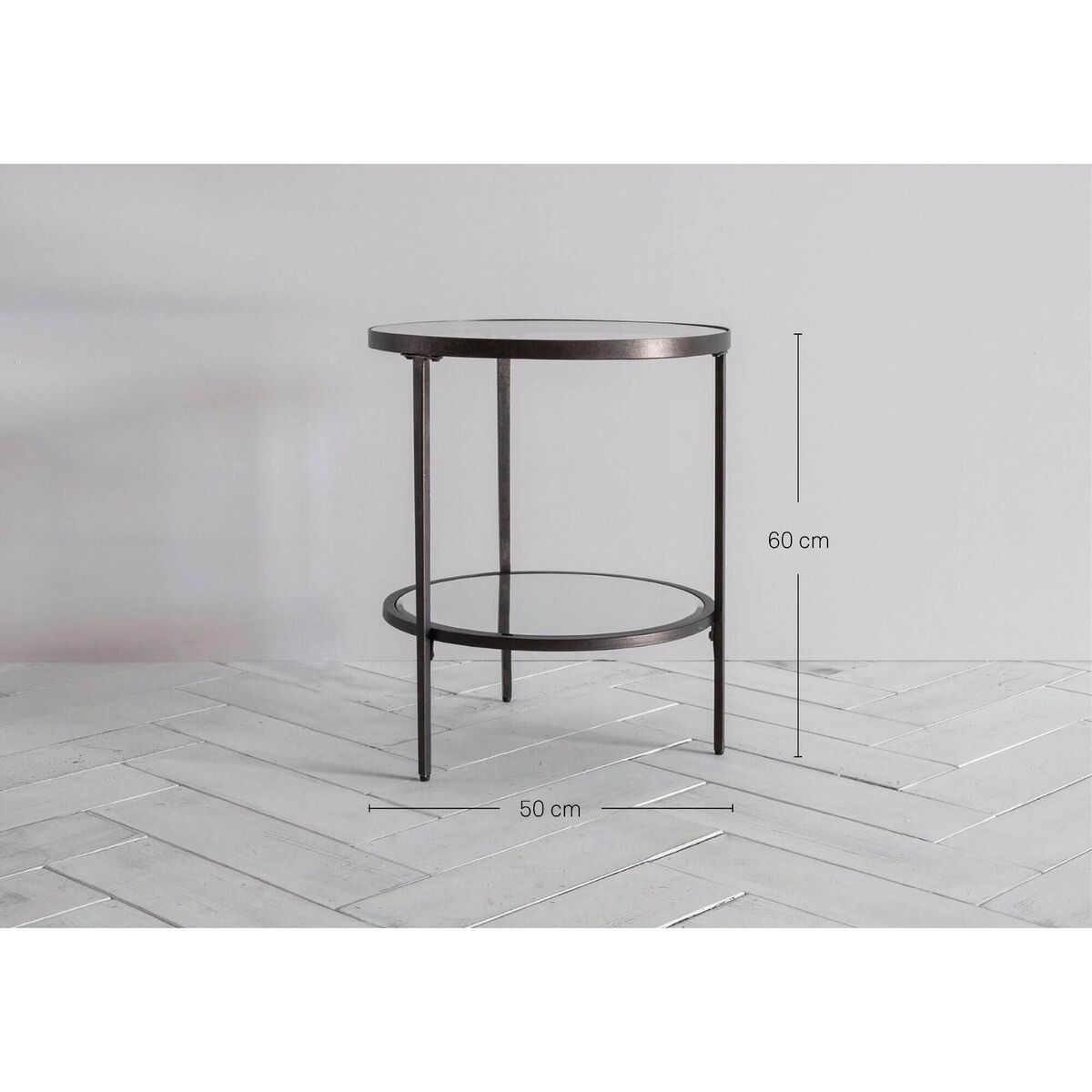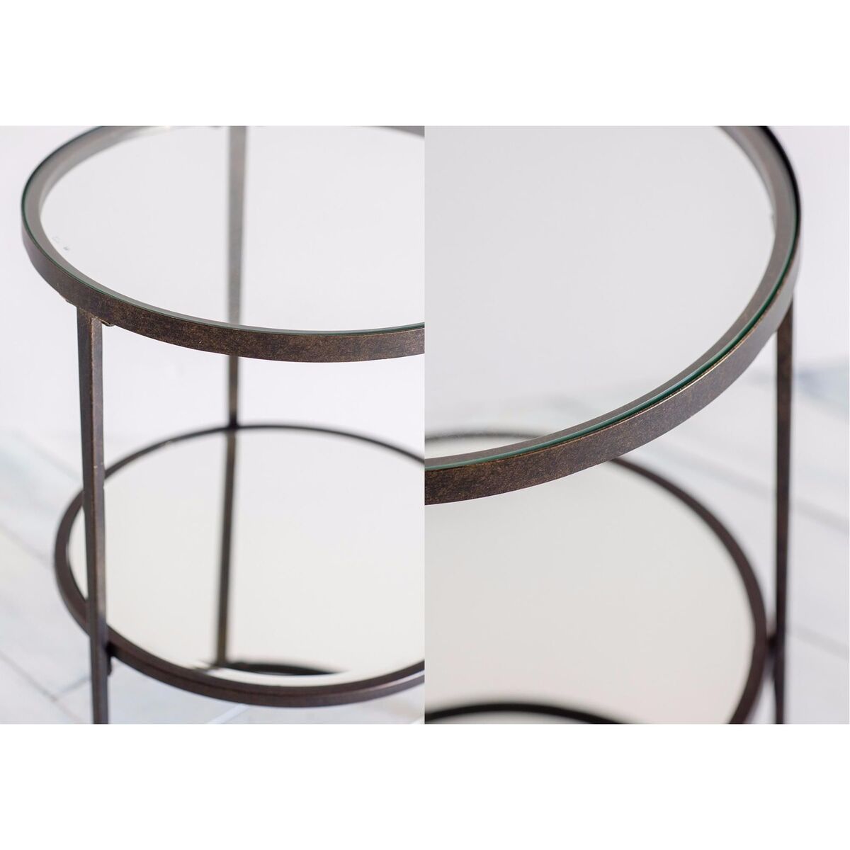The Aberdeen side table boasts a trendy circular tempered glass surface supported by clean and simple metal frames tastefully finished in aged bronze. The lower mirrored shelf is practical as well as deliciously decadent. Pair this side table with its matchingcoffee table, available in multiple colour tones. Packaging: H:60cm x W:50cm; 10.5kg Materials: Glass, Metal Assembly required: Yes
