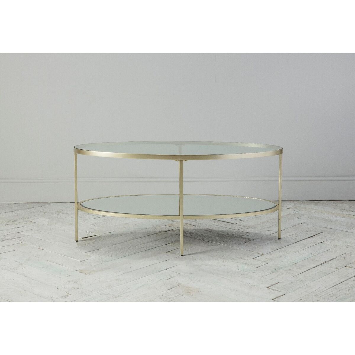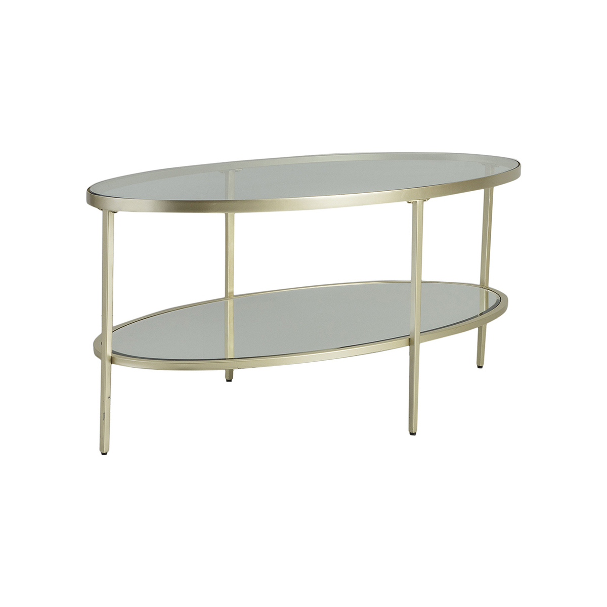 The Aberdeen coffee table boasts a trendy circular tempered glass surface and lower mirrored shelf, supported by clean and simple metal frame tastefully finished in aged champagne.