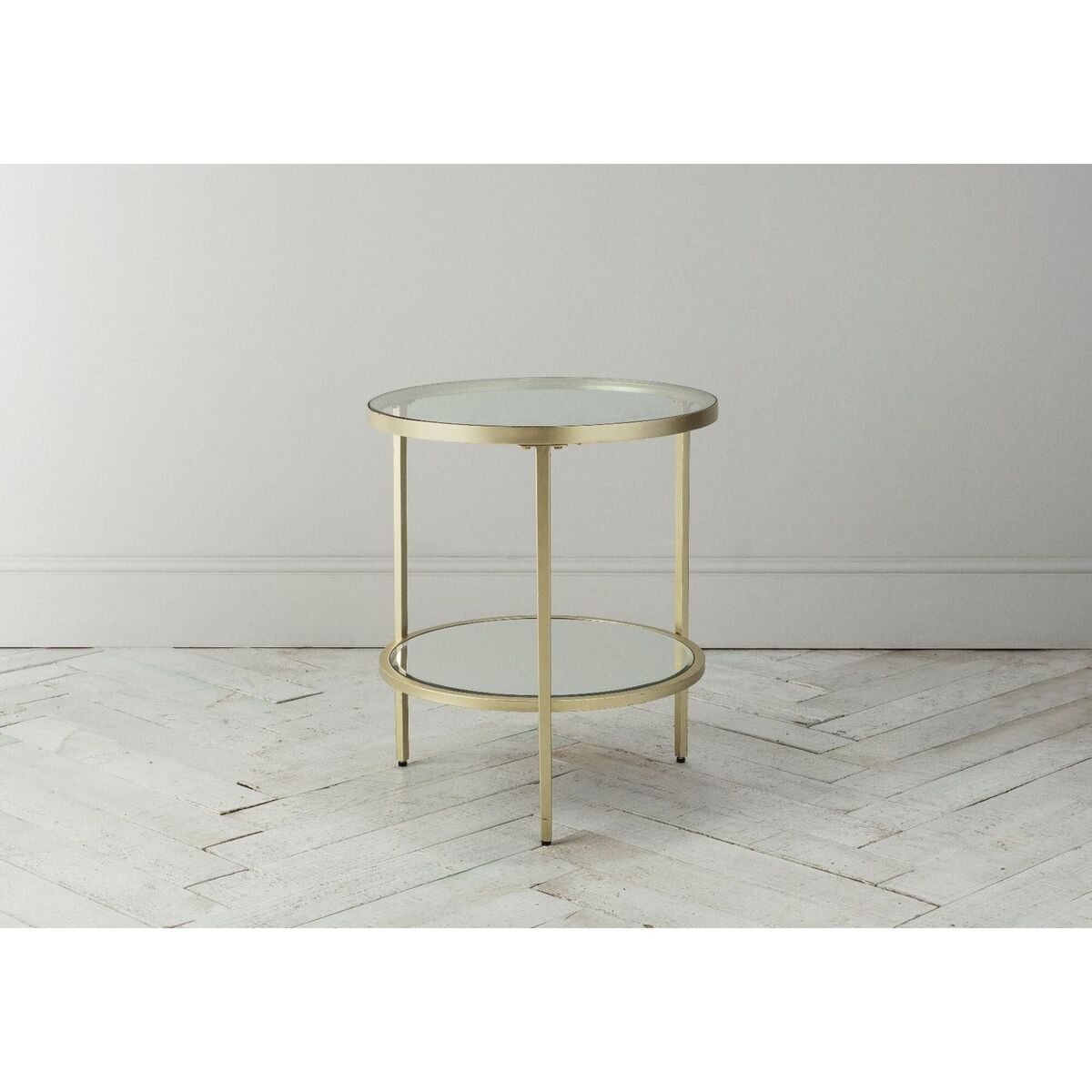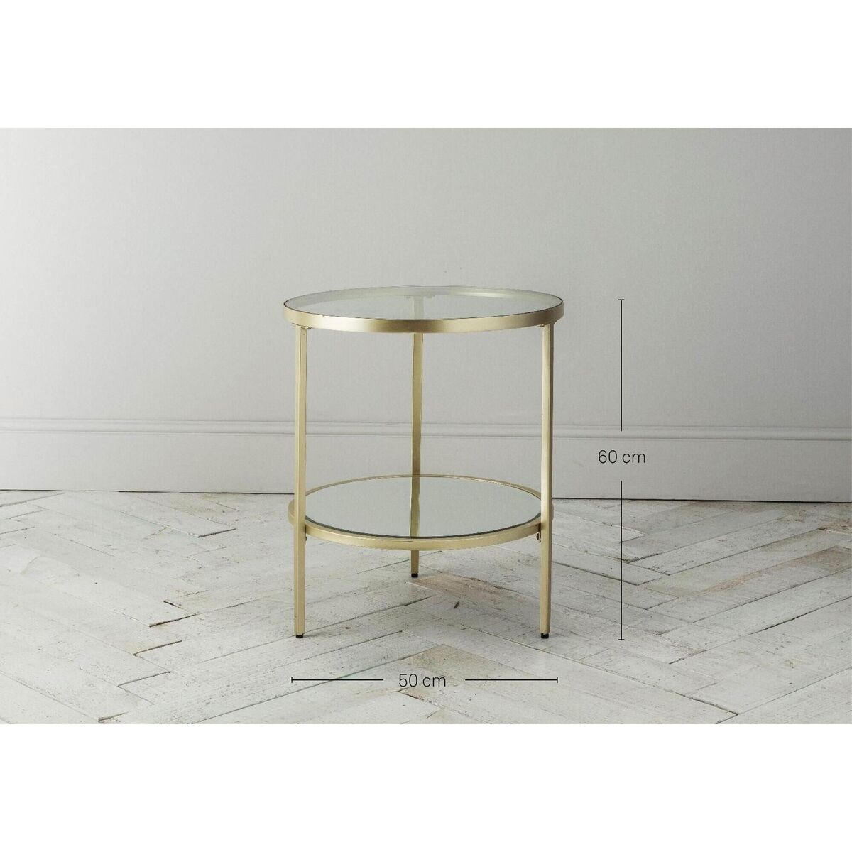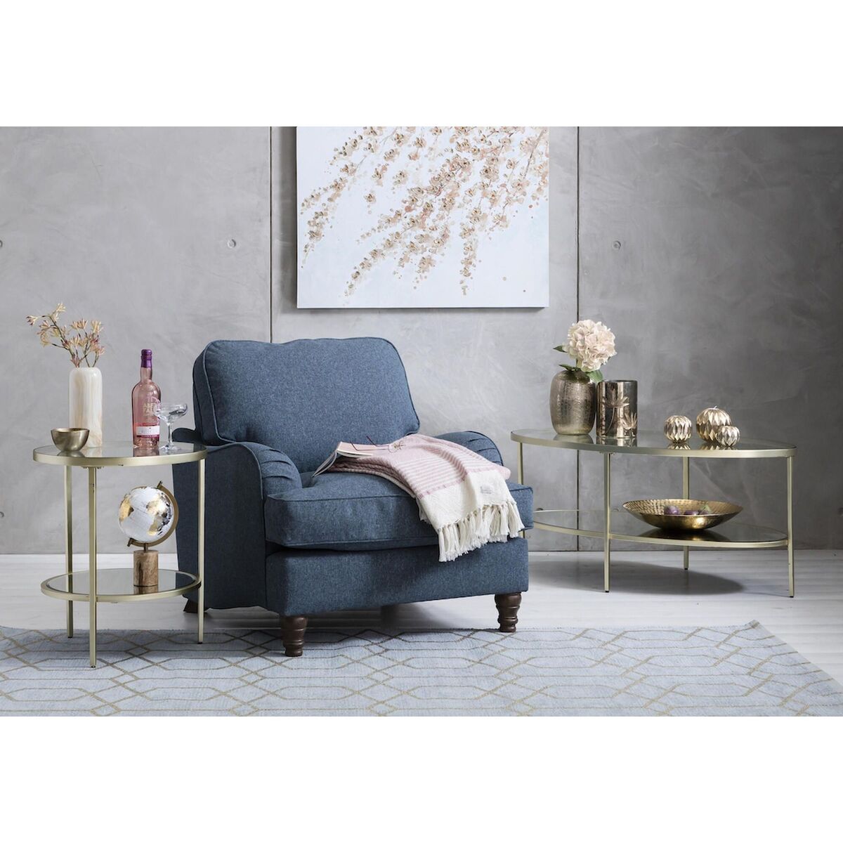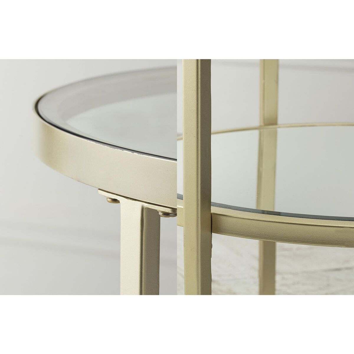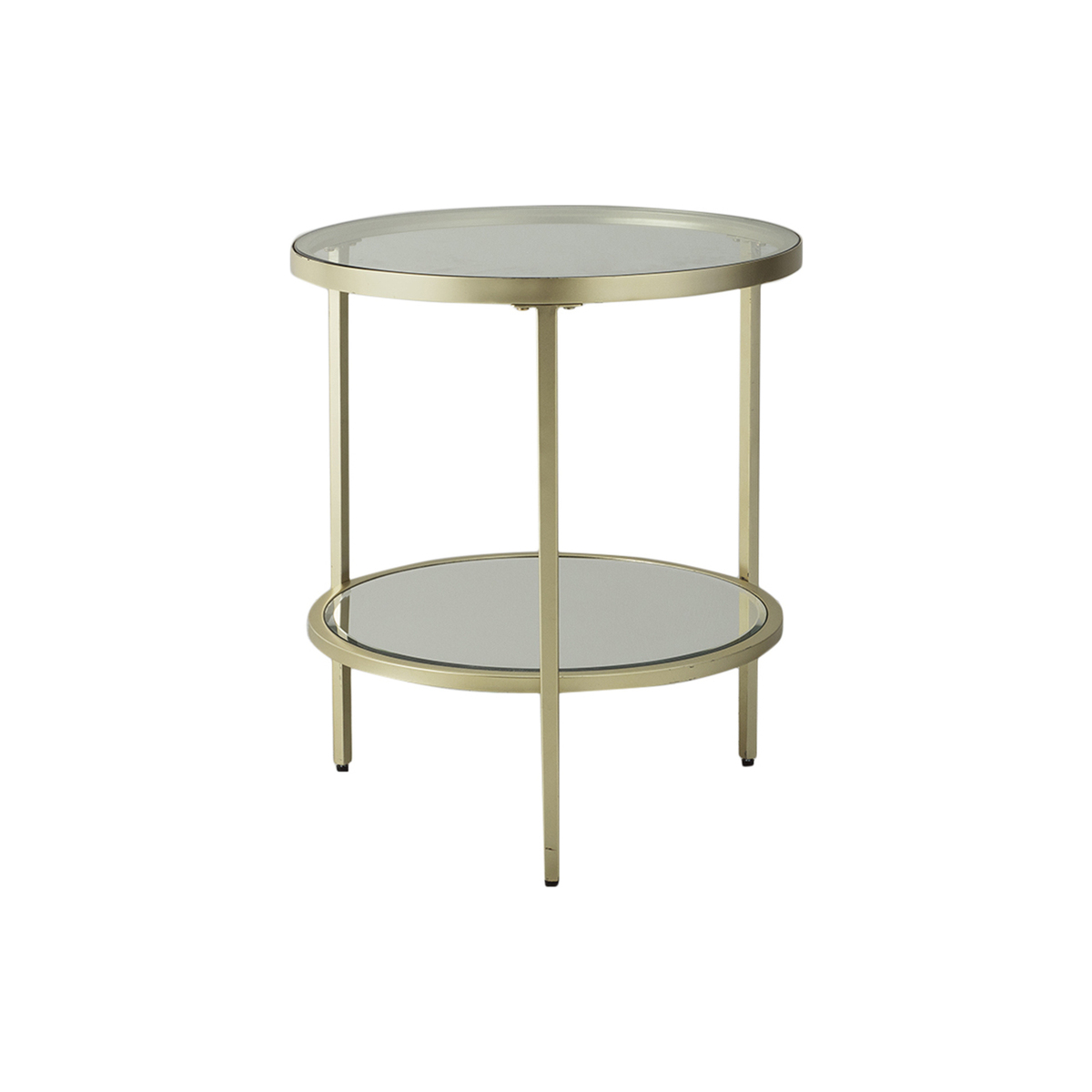 The Aberdeen side table boasts a trendy circular tempered glass surface supported by clean and simple metal frames tastefully finished in aged champagne. The lower mirrored shelf is practical as well as deliciously decadent. Pair this side table with its matching coffee table, available in an multiple colour tones.