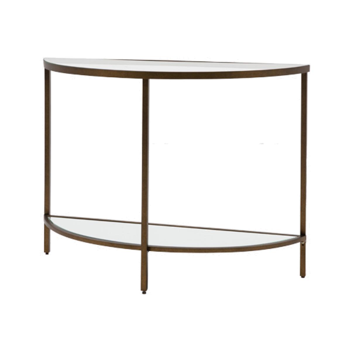 Add a touch of glamour to your room with the Aberdeen Console Table. Exuding glamour and luxe style this demi lune table's tempered glass shelf and mirrored lower shelf and champagne toned frame feels deliciously decadent.