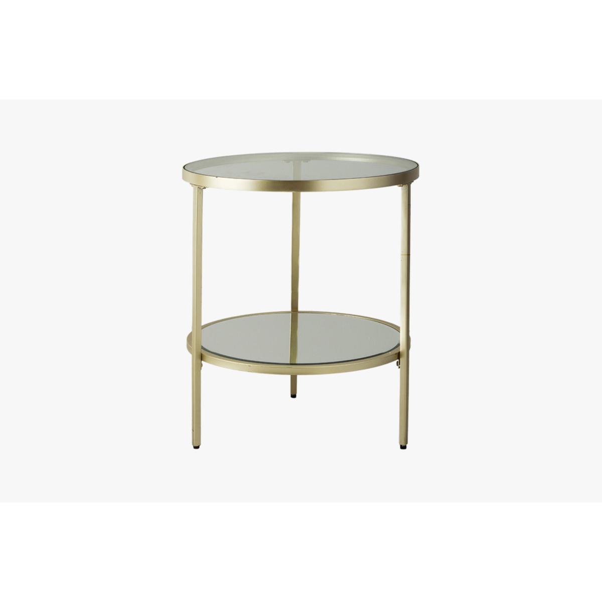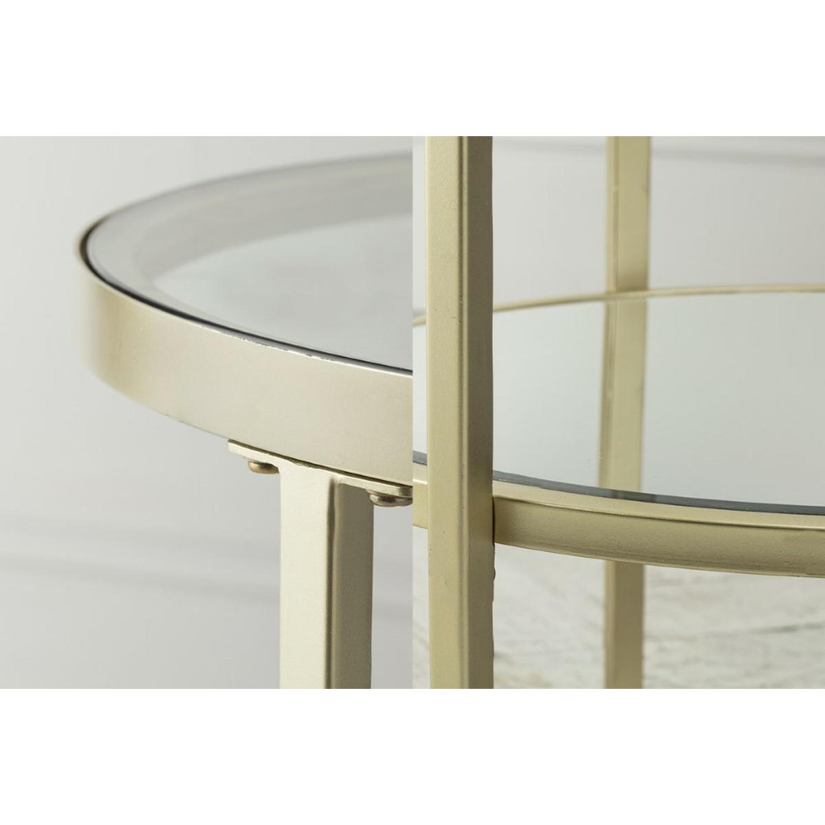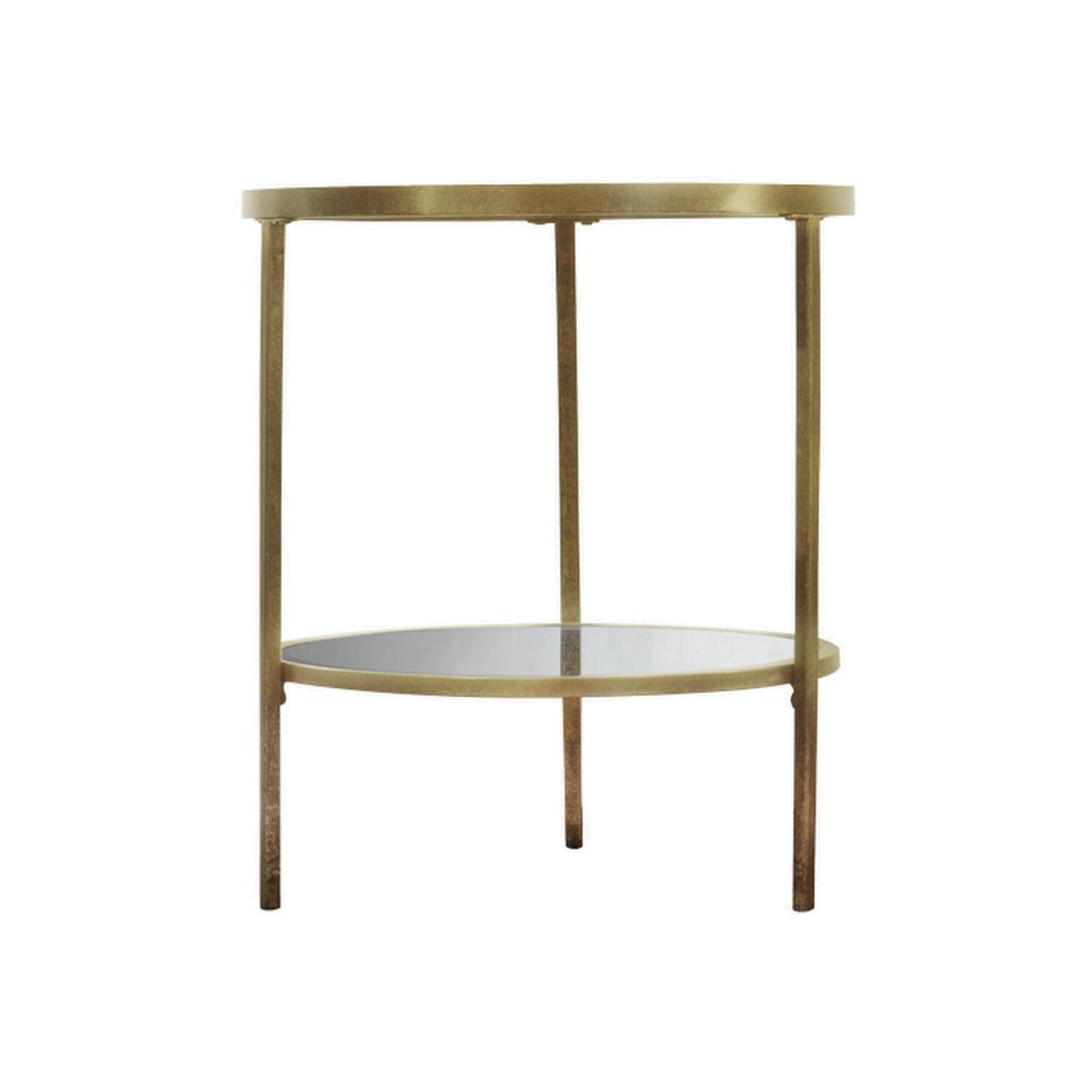 Set to impress. The Aberdeen side table boasts a trendy circular tempered glass surface supported by clean and simple metal frames tastefully finished in aged metal. The lower mirrored shelf is practical as well as deliciously decadent.