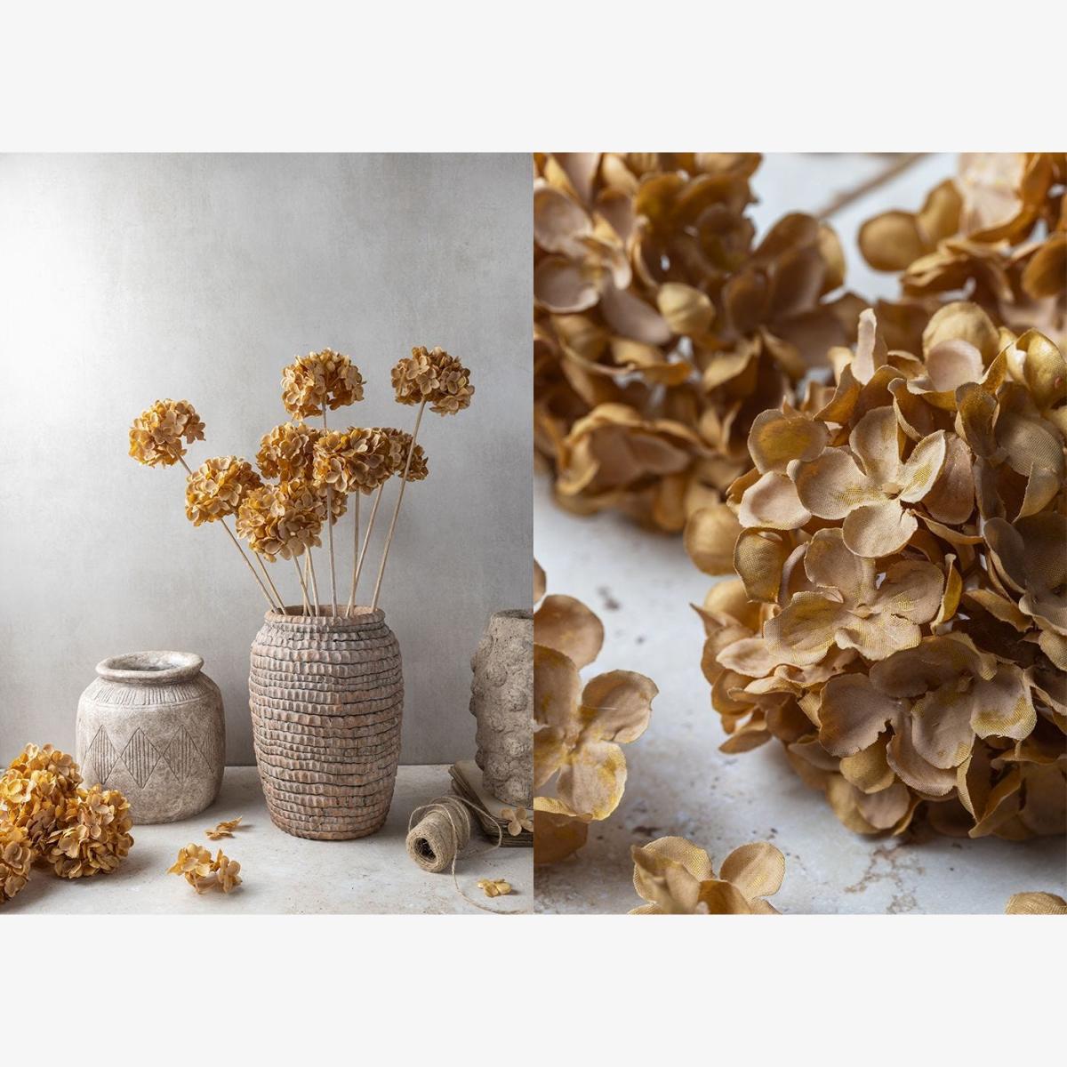 In the warmest of hues, the Hydrangea Walnut will look stunning with cream and blush hued stems. In a gorgeous warm walnut hue this fabulous Hydrangea will add some cool kudos to your home. With nuances in the tone of colour, each flower head is enhanced by its neighbour resulting in a cloud like head that is uniquely beautiful. We love the incredible effect a couple of stems of stunning flowers such as the Hydrangea have in a bottle like vessel. With an understated languid beauty they uplift a shelf, add some life to a side table, and height and texture to a mantle. Beautiful paired with creams, this stem will add depth and interest to your tablescape.
