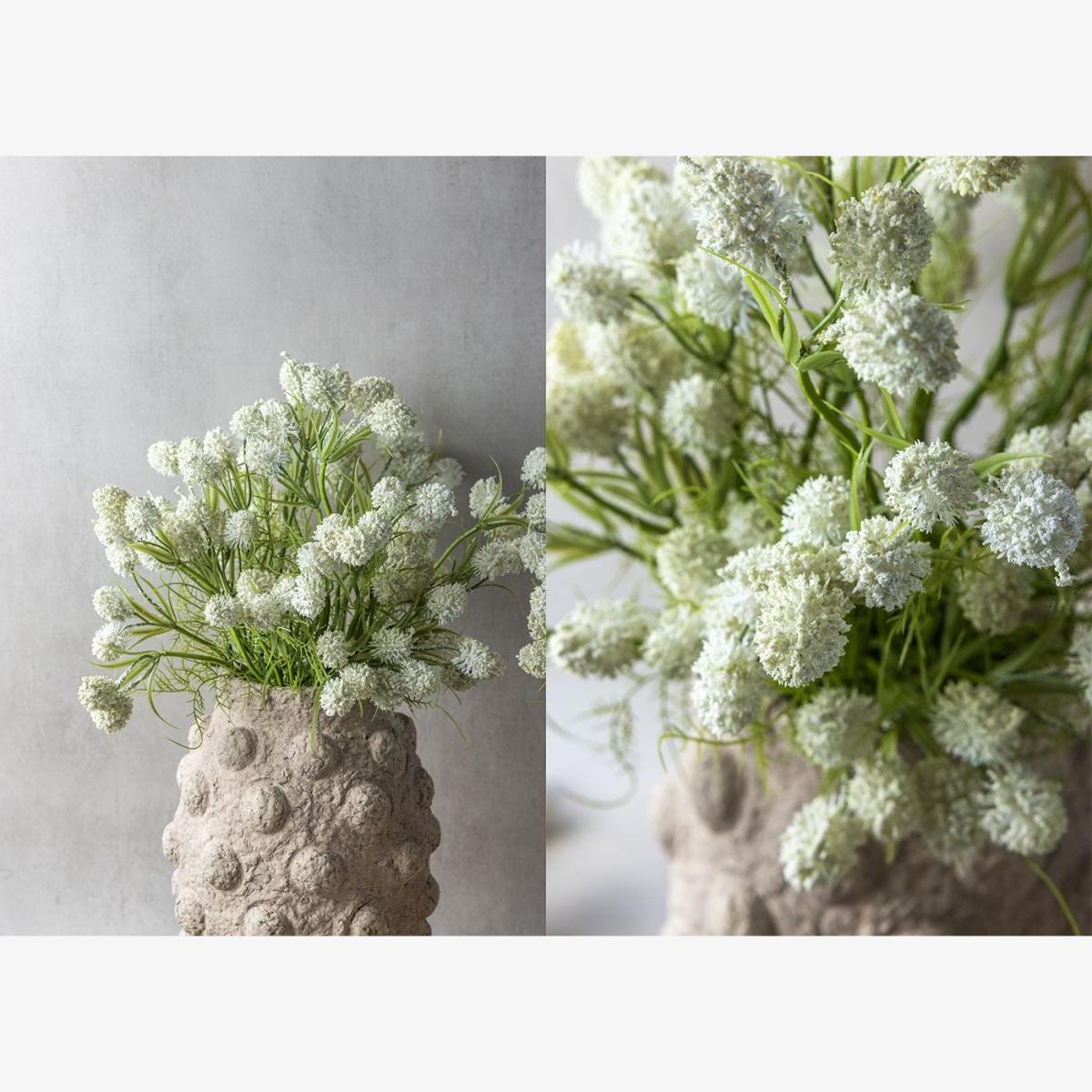 With a foraged vibe, the Meadow Thistle Bush is evocative of summery meadows and wild roadside beauty. The Meadow Thistle Bush has an understated beauty. Soft creamy flowers are gathered on stems with feathery foliage tendrils making this very easy on the eye. Amazingly versatile, this looks great on its own or as a support act to other blooms, and we’ll be using this everywhere.