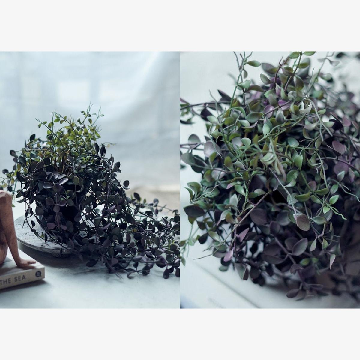 I love this faux trailing Dischidia because it brings a lush, effortless greenery to any space without the fuss of maintenance. It’s perfect for adding a touch of nature to shelves, side tables, or window sills, especially in interiors where live plants might not thrive - think sunny kitchens or shaded corners. Its realistic foliage works well in modern, minimalist, or even eclectic settings, providing a fresh, natural vibe. For styling tips, consider pairing it with simple ceramic pots or placing it in tall brass or matte black vessels for contrast. Draped over bookshelves or cascading from hanging baskets, it can soften hard edges and create a more inviting atmosphere without the need for frequent watering.