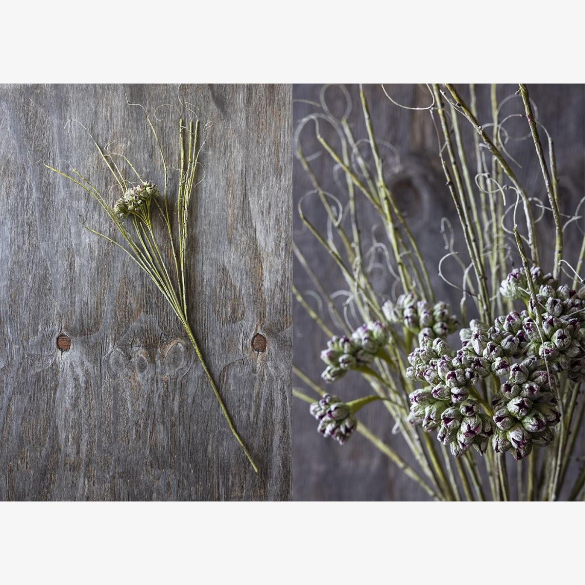 Mixing soft green and white tones with flashes of plum and a unique round shape, this leafy stem is full of intrigue. Whether you are creating a small bouquet or a single stem display, use the wild thistle to add height and texture to your vase.