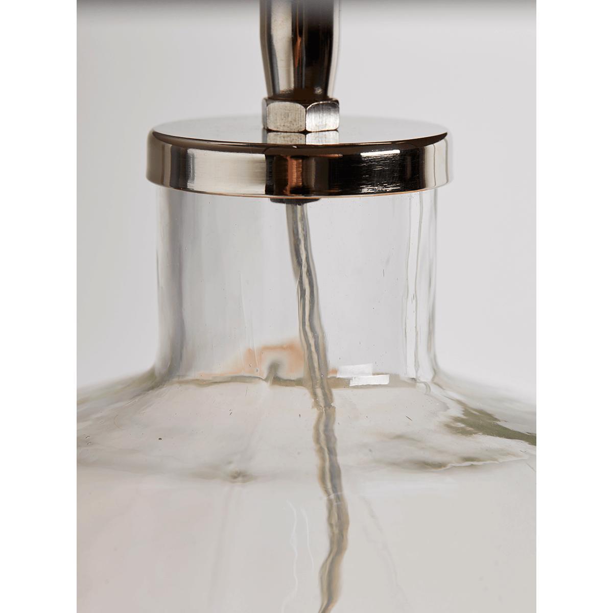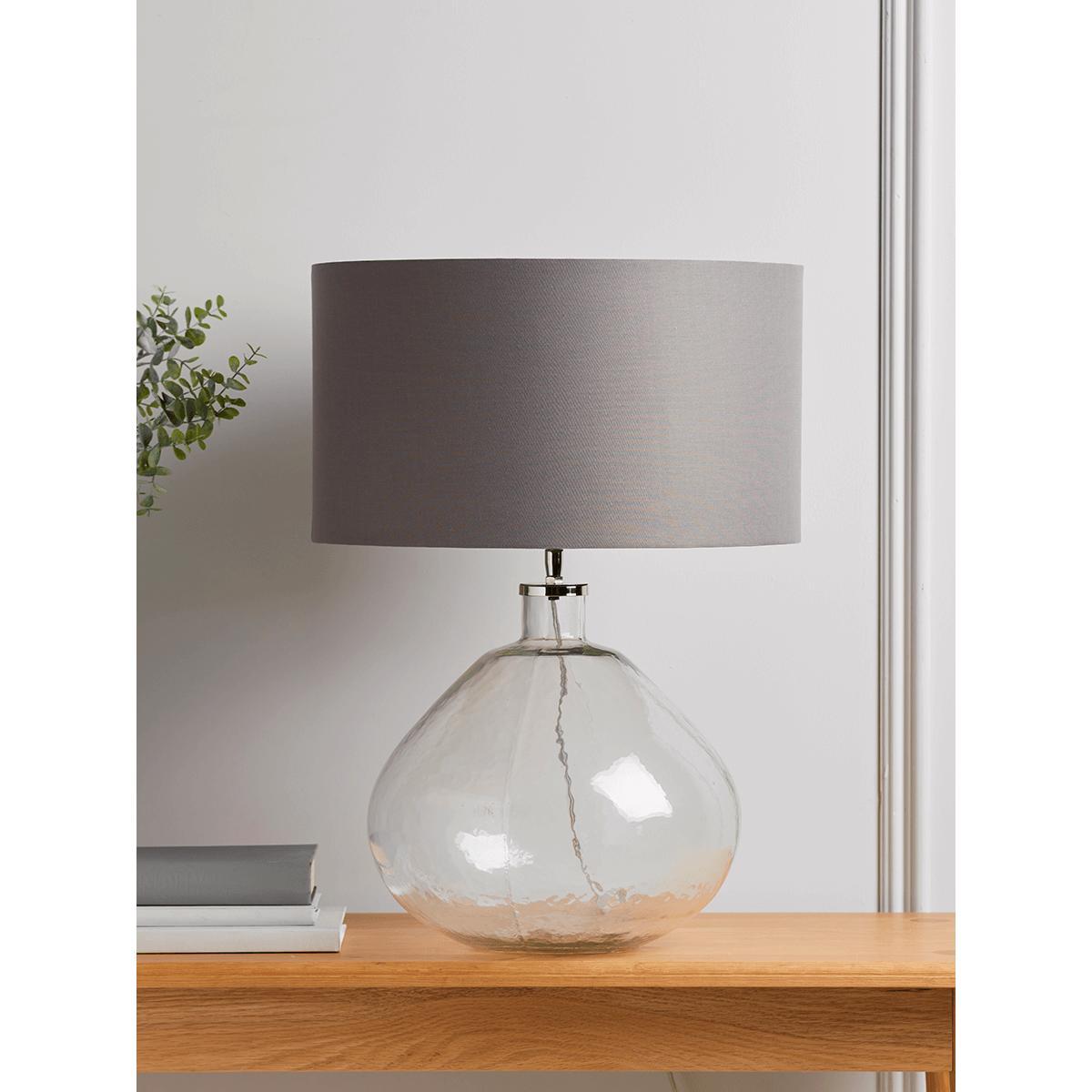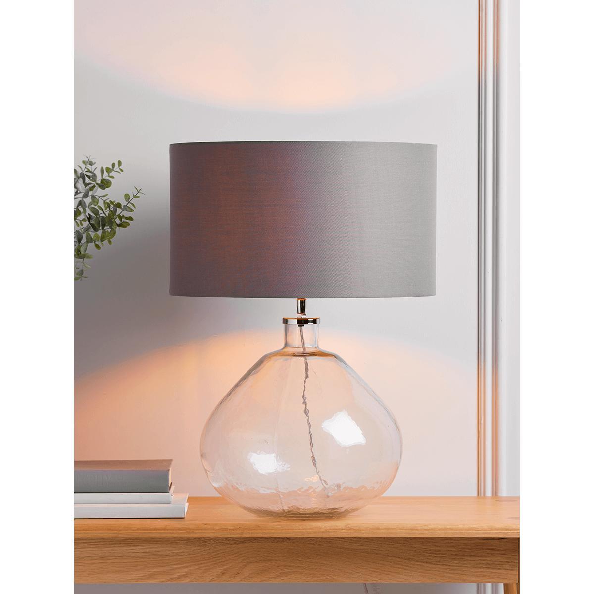 With a wonderful artisanal look and feel, our organic clear glass table lamp will add a unique touch to your décor. Each lamp is finished with an oversized dark grey shade and steel grey fittings.