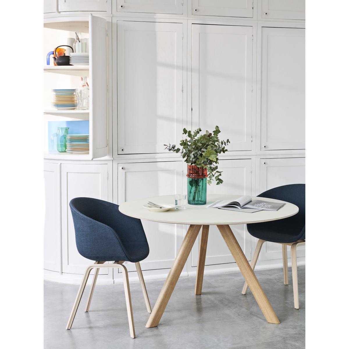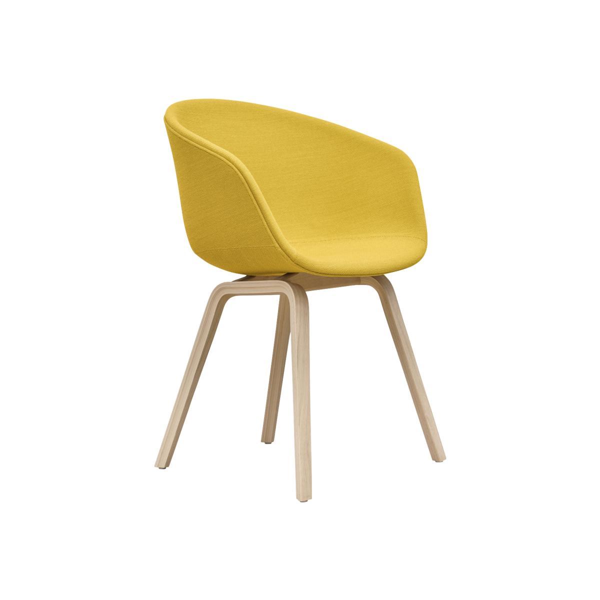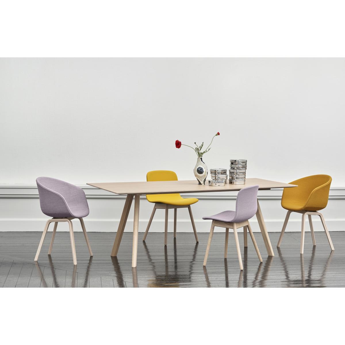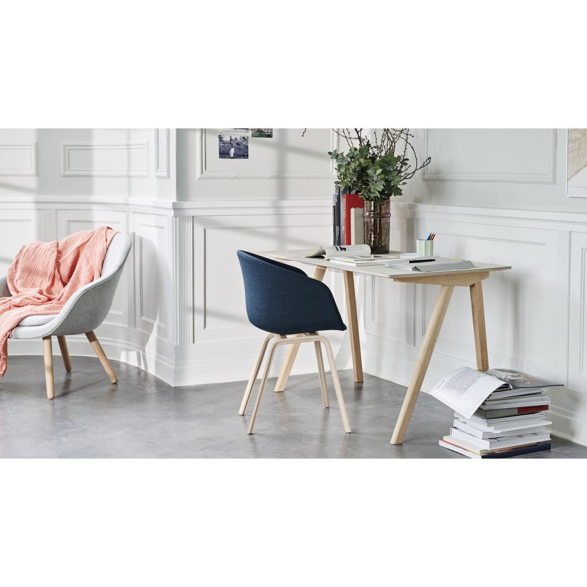 About a chair, the cult armchair by Hee Welling, is universal, timeless and ultra-comfortable. This version has a padded shell fully covered with high-end fabric. About a chair is versatile and fits perfectly into all spaces: house, office, contract. Its simple appearance lets it blend harmoniously into our daily lives without upsetting our visual environment. You can imagine it around a dining table in a living room or in front of a desk. The rounded shell is made of polypropylene, padded with a layer of polyester foam and covered with a superb high-quality fabric. Its welcoming, ergonomic shapes ensure optimal comfort. The base is made of oak plywood, covered with a particularly durable matt transparent varnish. About a chair perfectly illustrates Hay's work: understated lines, a universal and timeless style that stands the test of time while remaining elegant.