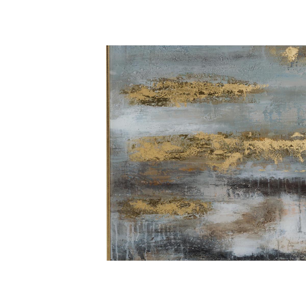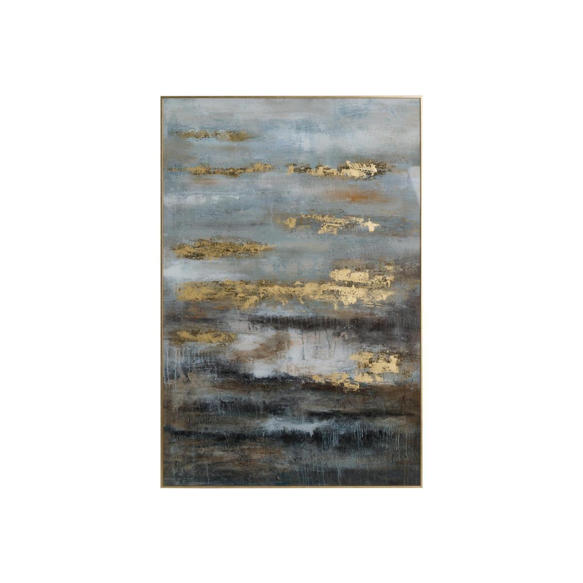 The large scale, abstract piece of wall art in rich greys, golds and blues has the dreamy quality of the sun breaking through a stormy sky. Painted on glass and finished with a gold frame. Why you’ll love it. Evocative and dreamy abstract artwork. Contemporary style. Beautiful greys, golds and blues. You see something different every time you look at it. Beautifully reproduced on glass. What you need to know. Glass artwork. In a gold finish steel frame. Strong wood backing. Wall fixings and instructions are provided. This wall art weighs over 11kg, so make sure the wall you fix it to can support it. Dimensions. Width: 80cm (32 inches). Depth: 4cm (2 inches). Height: 120cm (47 inches).