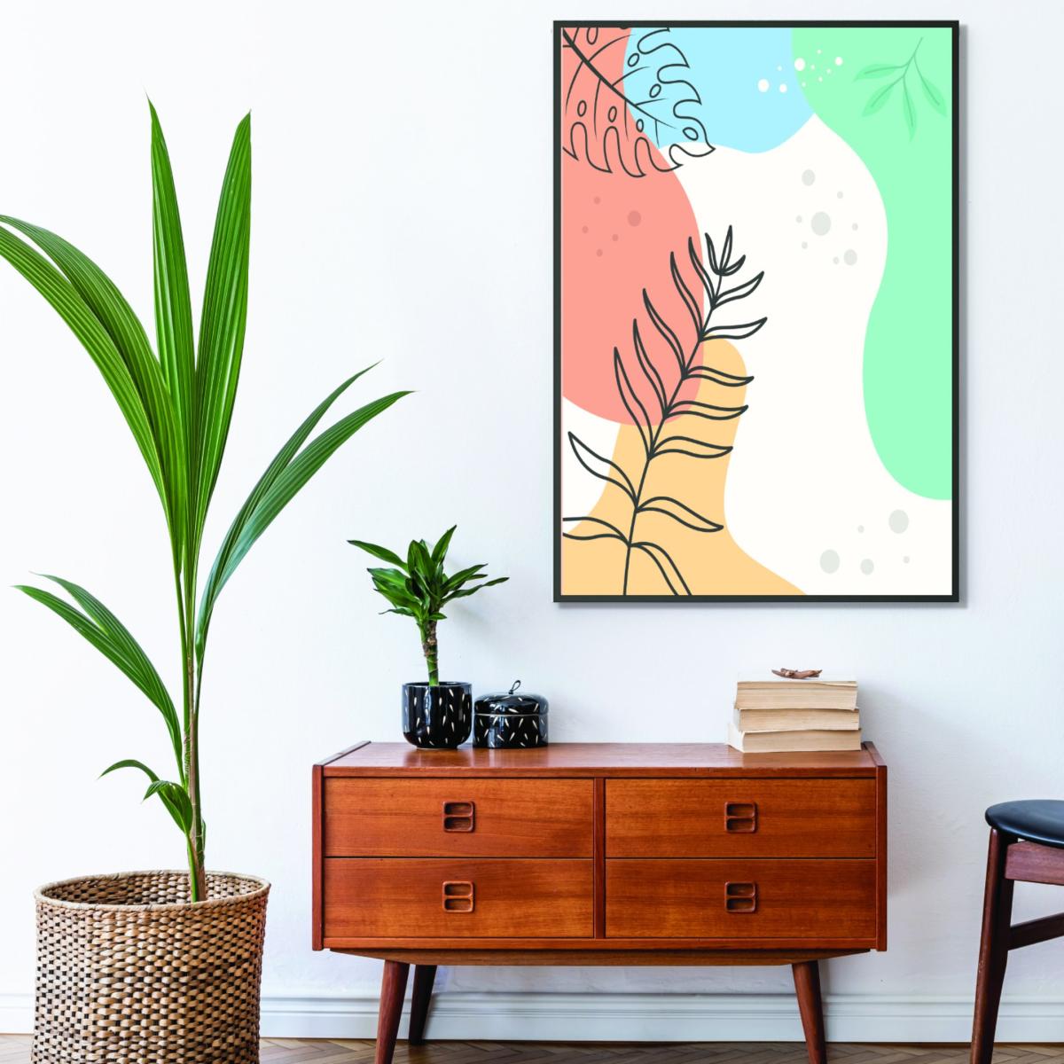 I love this piece because it combines a fresh, modern take on botanical themes with vibrant, playful colours. It works particularly well in contemporary or minimalist interiors where it can add a pop of colour and visual interest. The abstract leaf design lends itself to effortless styling-try pairing it with neutral or pastel tones for a calming effect, or mix it with other colourful artwork for a more dynamic look. Practical tips include hanging it above a sofa or bed to create a focal point, or in a hallway to introduce personality to transitional spaces. Its size makes it versatile for various wall spaces, and framing it simply will keep the focus on its bold, abstract design.