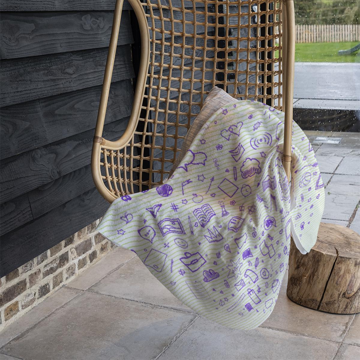 I really like this throw because of its bold abstract line pattern combined with colourful school supplies, giving it a playful yet chic feel. The purple hue makes it versatile for both children’s bedrooms and casual living spaces, adding a splash of colour without overwhelming the decor. It’s a practical choice for layering on sofas or beds-perfect for adding a pop of interest and extra warmth. For styling, consider pairing it with neutral or pastel tones to let the design stand out or draping it over a rattan chair for a relaxed, contemporary look. It works particularly well in eclectic or modern interiors where playful patterns and colours are welcome.