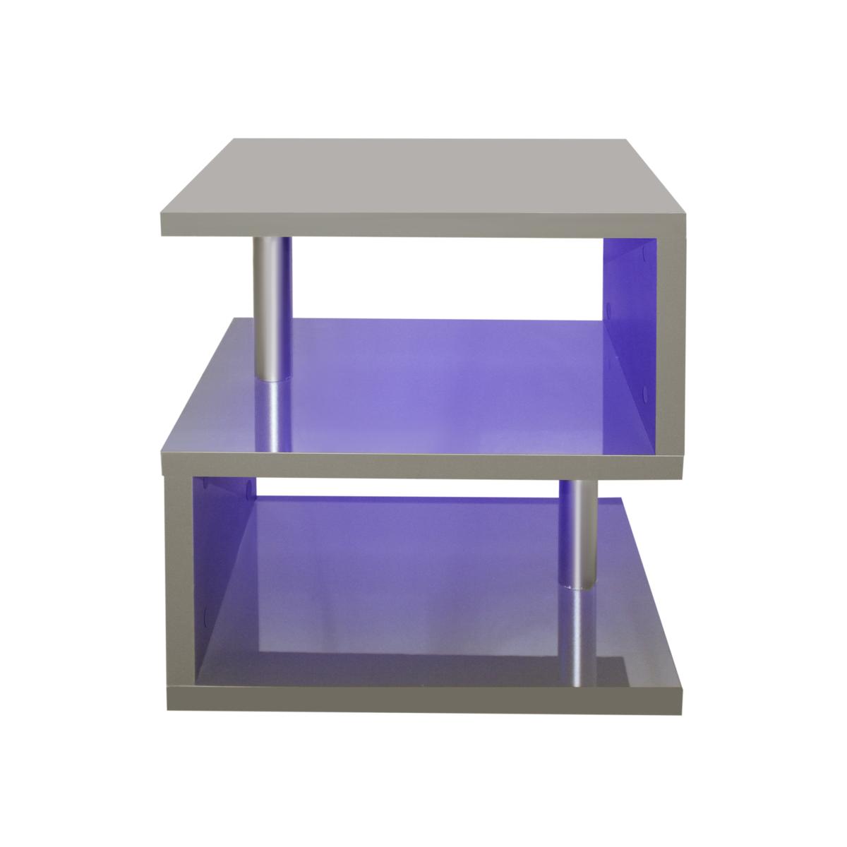 Transform your living space with this stunning modern side table featuring sleek LED illumination. The contemporary S-shaped design showcases three spacious display tiers, perfect for showcasing books, photographs, or decorative items. Crafted with a luxurious high-gloss finish, this versatile piece doubles as both functional furniture and ambient lighting. The chrome-finished support columns add an extra touch of sophistication, while the LED light creates a mesmerising glow that enhances your room's atmosphere. Available in black, white, grey, black with marble effect or white with marble effect, this table makes an ideal accompaniment to any modern interior. The robust construction ensures stability, while its compact footprint makes it perfect for positioning next to sofas, beds, or in corners where you need both storage and illumination. The LED lighting with 16 colour options creates the perfect ambience for evening relaxation or entertainment. Please note that dimensions are approximate; please allow room for slight variations.