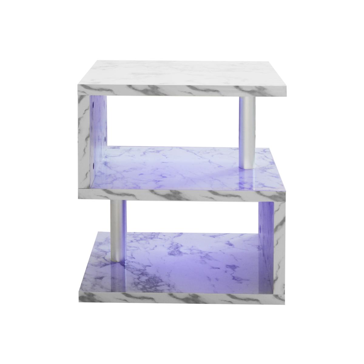 Transform your living space with this stunning modern side table featuring sleek LED illumination. The contemporary S-shaped design showcases three spacious display tiers, perfect for showcasing books, photographs, or decorative items. Crafted with a luxurious high-gloss finish, this versatile piece doubles as both functional furniture and ambient lighting. The chrome-finished support columns add an extra touch of sophistication, while the LED light creates a mesmerising glow that enhances your room's atmosphere. Available in black, white, grey, black with marble effect or white with marble effect, this table makes an ideal accompaniment to any modern interior. The robust construction ensures stability, while its compact footprint makes it perfect for positioning next to sofas, beds, or in corners where you need both storage and illumination. The LED lighting with 16 colour options creates the perfect ambience for evening relaxation or entertainment. Please note that dimensions are approximate; please allow room for slight variations.