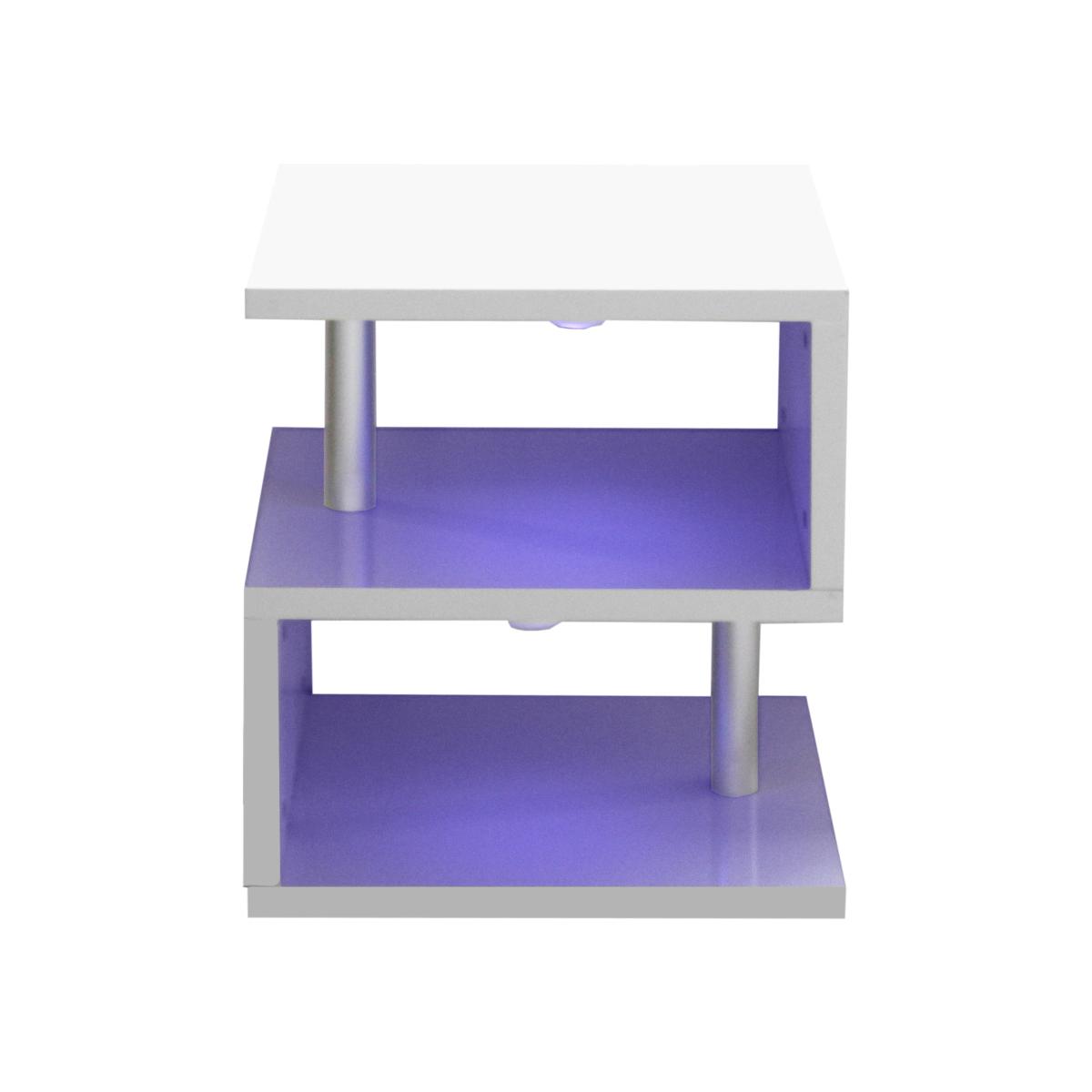 Transform your living space with this stunning modern side table featuring sleek LED illumination. The contemporary S-shaped design showcases three spacious display tiers, perfect for showcasing books, photographs, or decorative items. Crafted with a luxurious high-gloss finish, this versatile piece doubles as both functional furniture and ambient lighting. The chrome-finished support columns add an extra touch of sophistication, while the LED light creates a mesmerising glow that enhances your room's atmosphere. Available in black, white, grey, black with marble effect or white with marble effect, this table makes an ideal accompaniment to any modern interior. The robust construction ensures stability, while its compact footprint makes it perfect for positioning next to sofas, beds, or in corners where you need both storage and illumination. The LED lighting with 16 colour options creates the perfect ambience for evening relaxation or entertainment. Please note that dimensions are approximate; please allow room for slight variations.