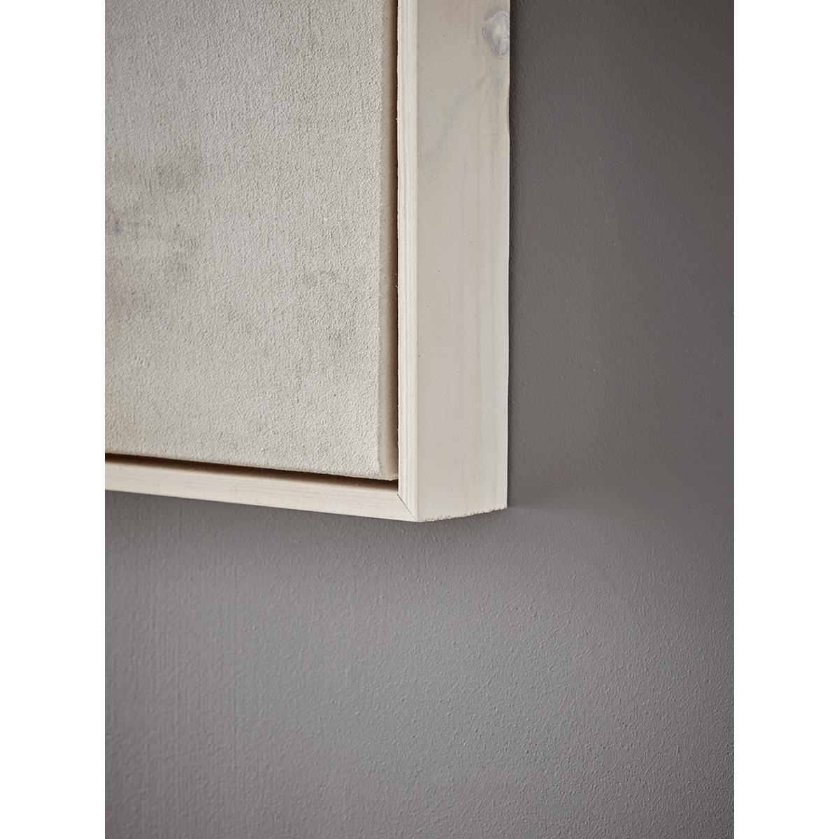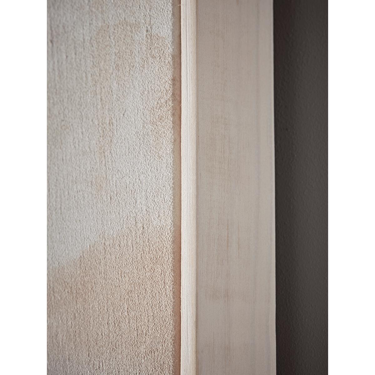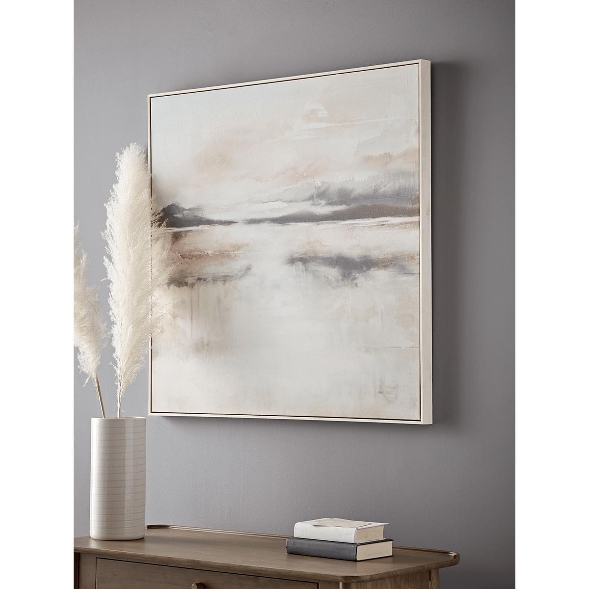 With the gentle impression of a distant coastline at sunrise, our canvas is full of a hazy morning atmosphere. Hung to any living space our abstract subject makes a serene impression with the soft palette of greys, pale blush and soft whites. Hand finished, each canvas has a unique design and texture and is surrounded by a complementing slender, whitewashed frame.