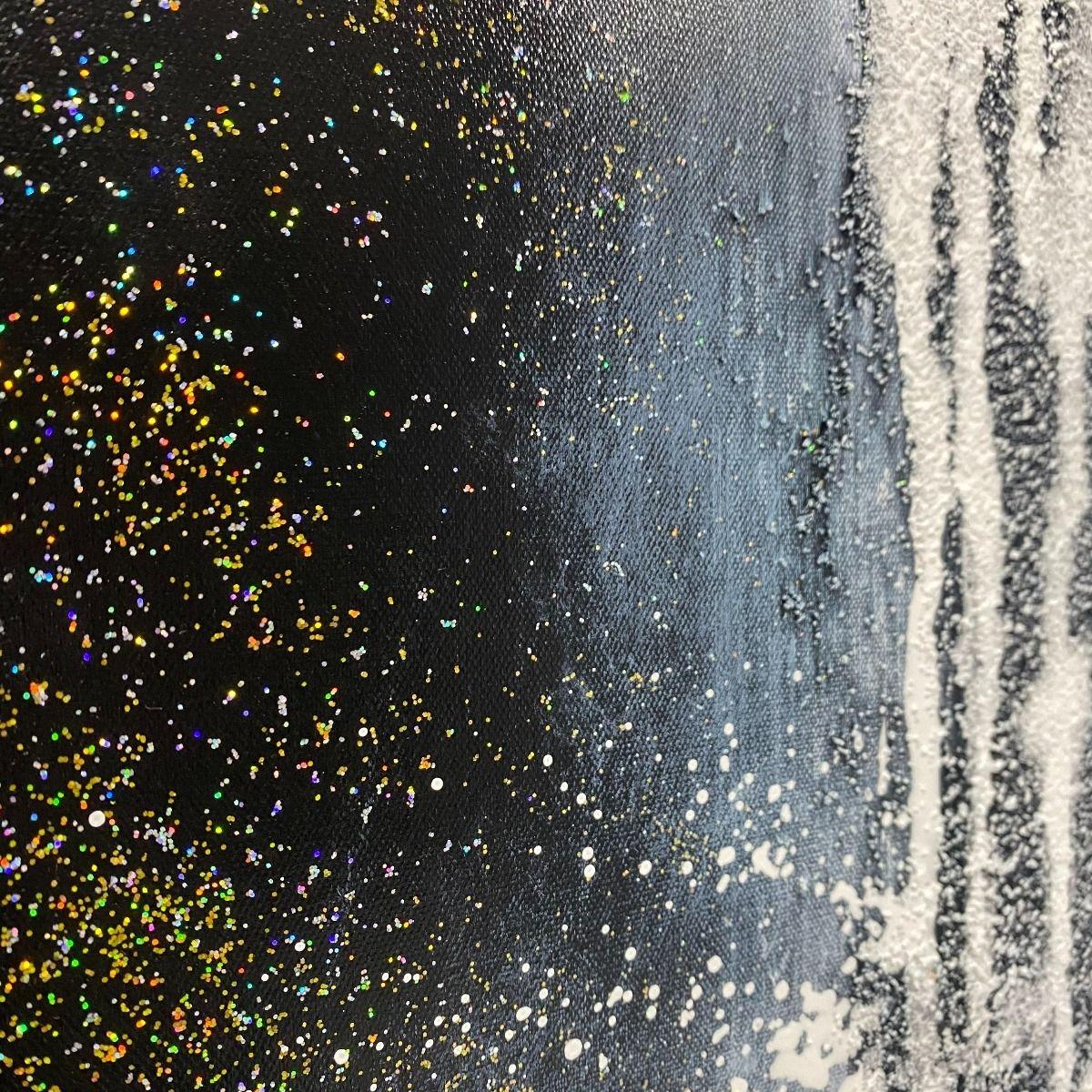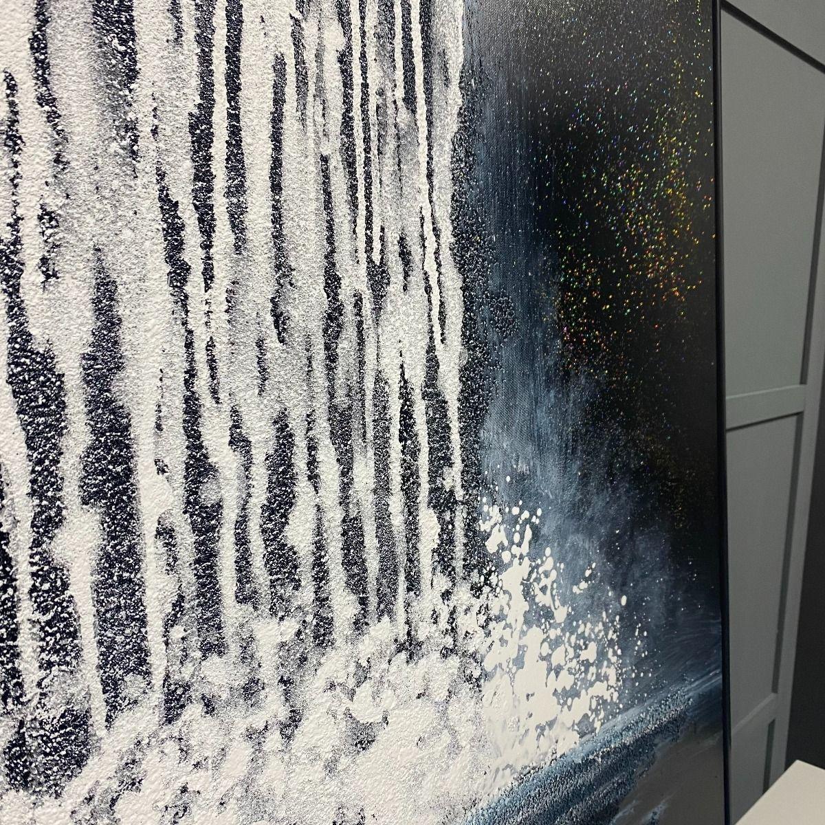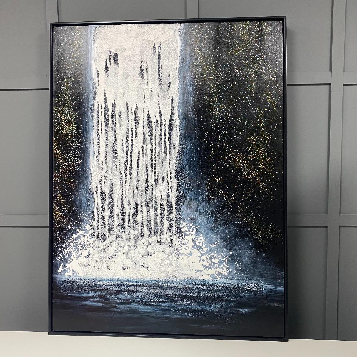 Abstract waterfall painted canvas boasting a black frame. Update any room with the Abstract Waterfall painted canvas boasting glitter detailing and black frame. Featuring a textured waterfall scene, perfect for contemporary interiors.