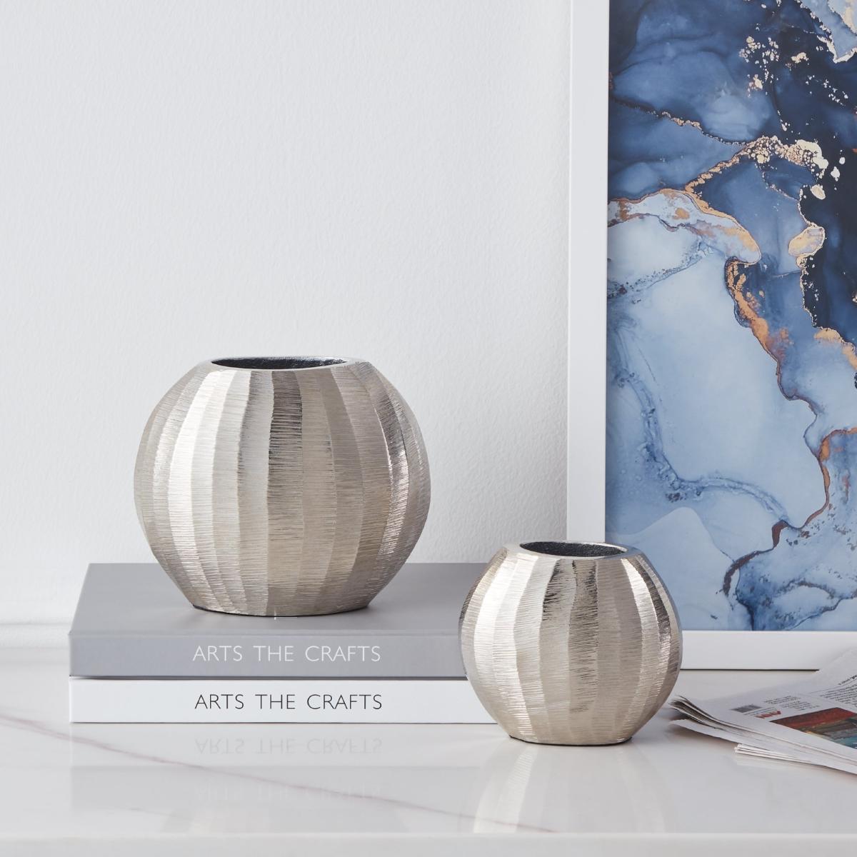 I love this small round vase for its simple yet sophisticated design, making it a versatile addition to various spaces. Its understated metallic finish and rounded shape lend themselves well to contemporary, minimalist, or even eclectic interiors. It works particularly well as a standalone statement piece on a console table or shelf, and you can style it with a single stem or small bouquet for a touch of greenery without clutter. For practical styling, consider pairing it with other textured or metallic accessories to create cohesion, or use it to break up larger displays-its size makes it perfect for balancing out other decorative items without overwhelming the scene.