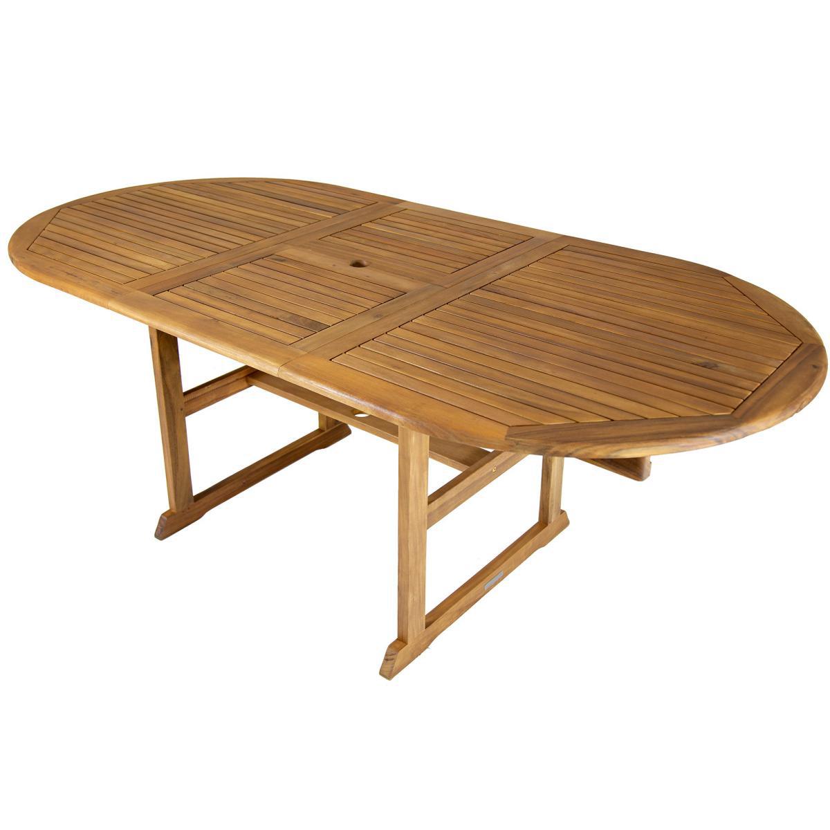 Fashioned from acacia wood, this oval dining set is a contemporary addition to any garden. Its ability to extend means that it is perfect for hosting friends and family this summer. Featuring folding chairs for easy storage, and a central hole (52mm) for a parasol. We recommend that you cover this product whilst it is not in use. Please note: Parasols are sold separately.