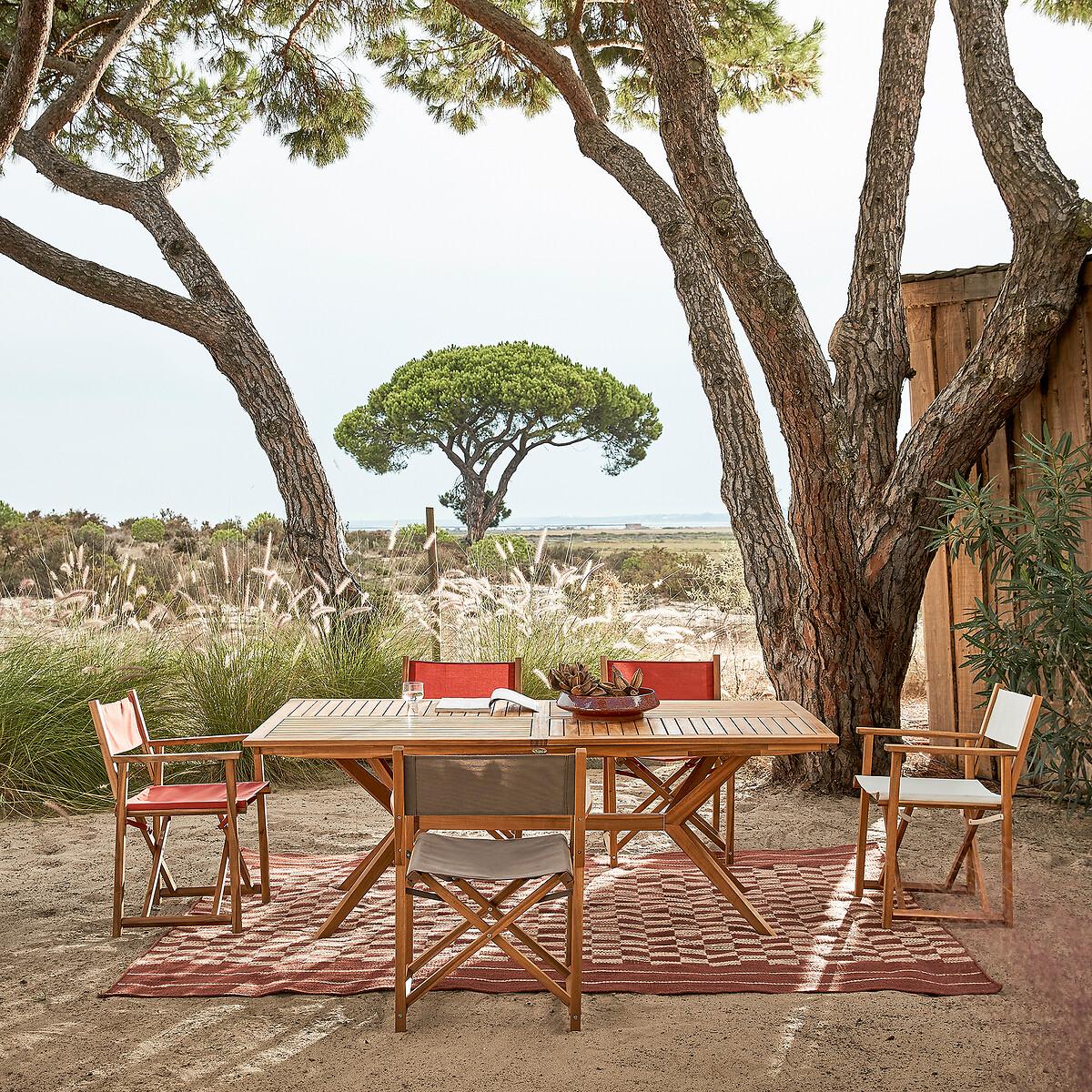 Relax in style with the weather-resistant Alfred armchair, made from resilient canvas and teak-stained acacia wood with a beautiful oiled finish. Easy to transport, this folding dining chair is really versatile, ideal indoors or outdoors. Product Details • Frame in FSC®-certified acacia with teak stain and oil finish • 100% polyester canvas, treated for outdoor use. • Supplied ready assembled. Dimensions • L59 x H85 x D54cm • Seat: L45 x H47 x D45 cm • Armrest height from the ground: 65cm • WOOD FROM SUSTAINABLY MANAGED FORESTS. FSC® certified wood comes from forests that are environmentally, socially and economically well managed. Dimensions and weight of parcel • L88 x H25 x D58cm, 6.5kg