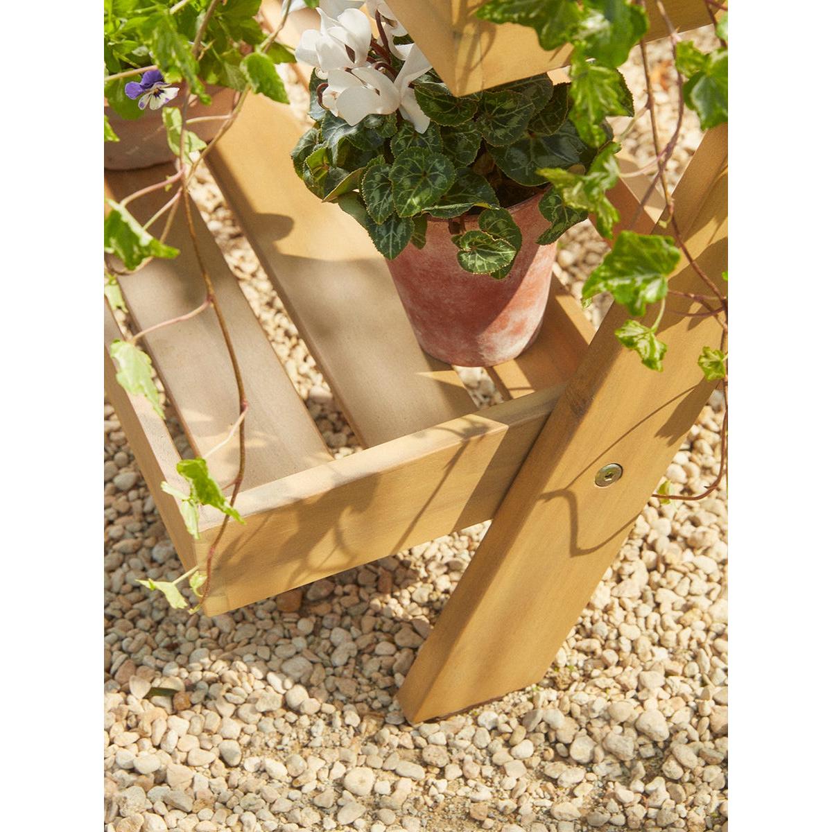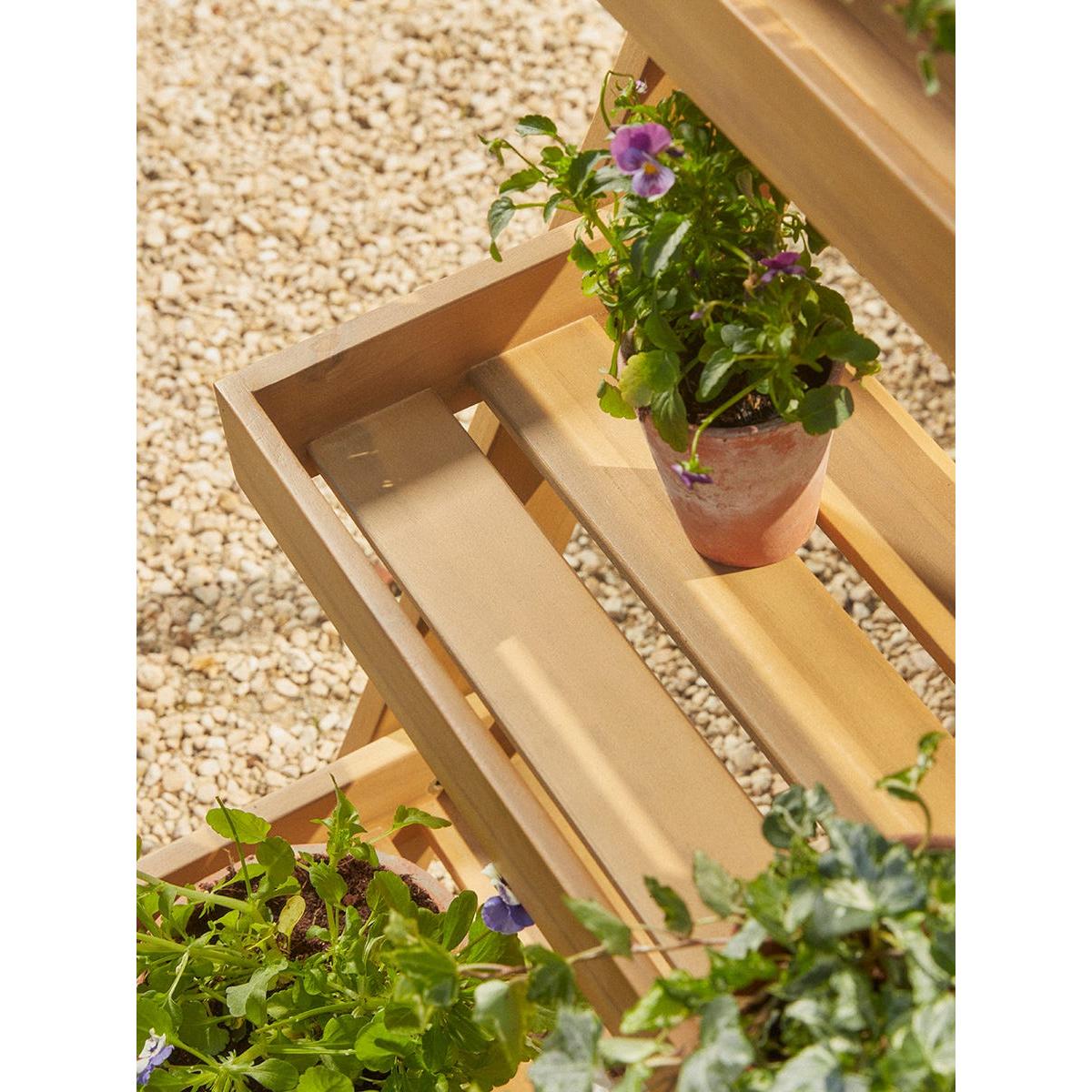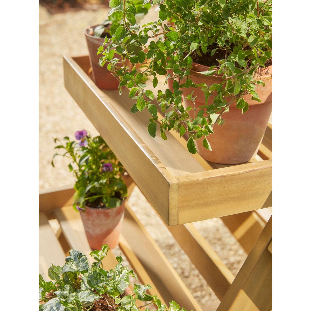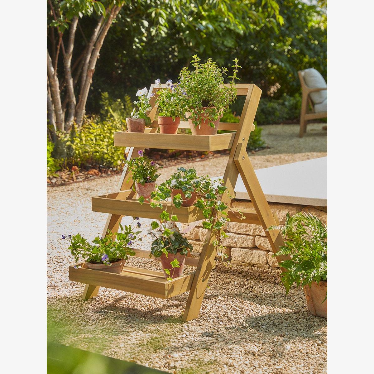 This acacia wood plant stand is the perfect way to display a collection of plants which require similar care or fragrant plants where the tiered shelves allow the aroma to rise around your outdoor space.  The three shelves are supported on a sturdy A-frame and have a raised lip at the front to stop pots from sliding forward.  Perfect for traditional and country gardens, this charming plant theatre brings a classic look to your garden design and can be folded down when not in use.