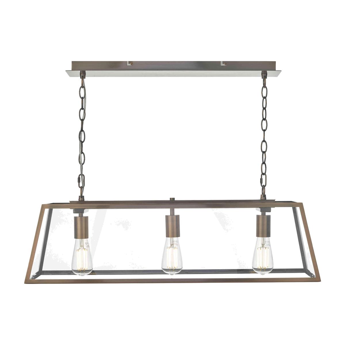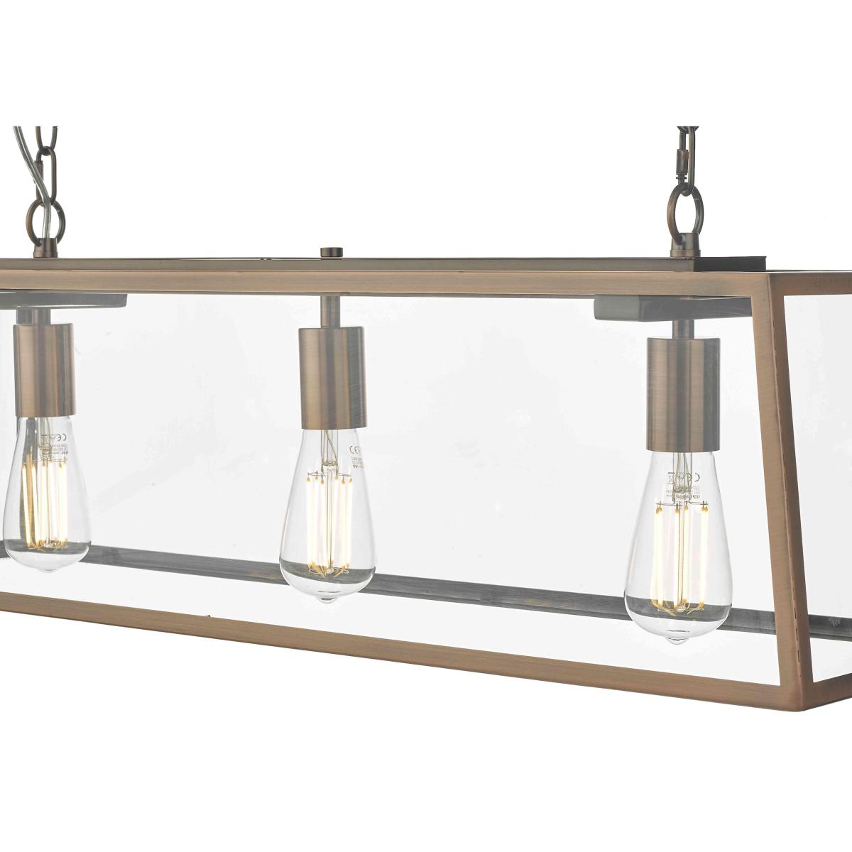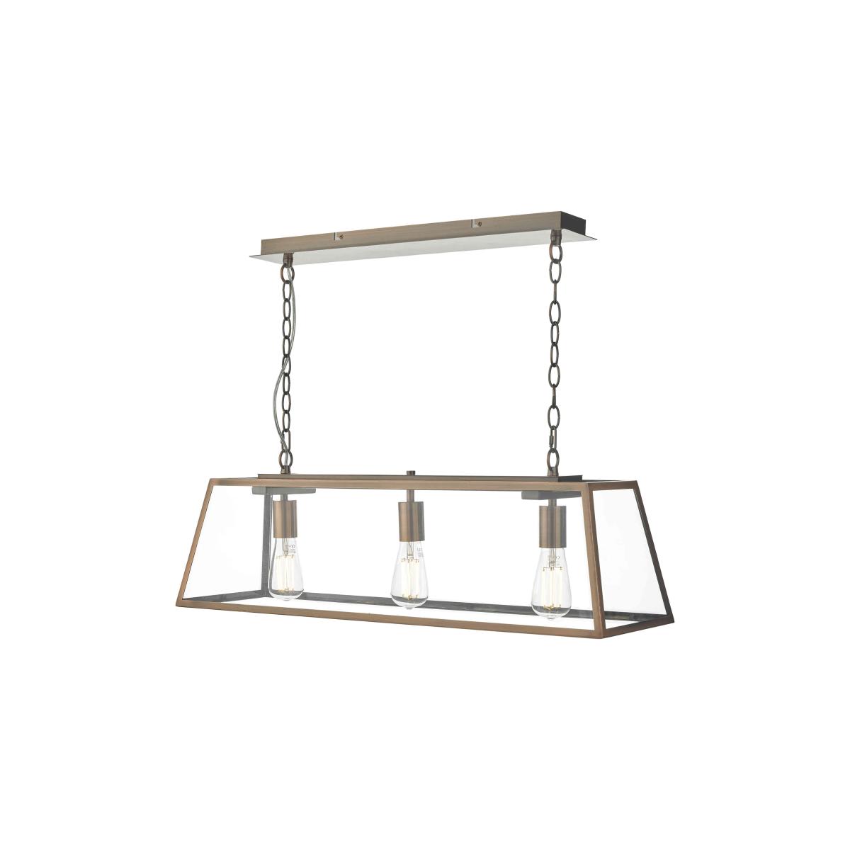 With three lights behind glass panels and an antique copper-finished metal frame, this ceiling pendant makes a quiet statement. Why you'll love it This striking metal and glass ceiling pendant has a beautiful finish. Sophisticated industrial style. Metal frame and ceiling plate have a stunning antique copper finish. Clear glass panels. Accommodates 3 light bulbs. Height-adjustable on installation. This bar pendant light is part of the Furniture Village lighting collection. What you need to know Metal and glass. Supplied with 150 cm of cable and chain. Requires 3 x E27 ES max. 60 W bulbs (not included). Professional installation recommended. Dimensions Height: max. 185cm (73 in). Depth: 24 cm (10 in). Width: 84 cm (34 in).